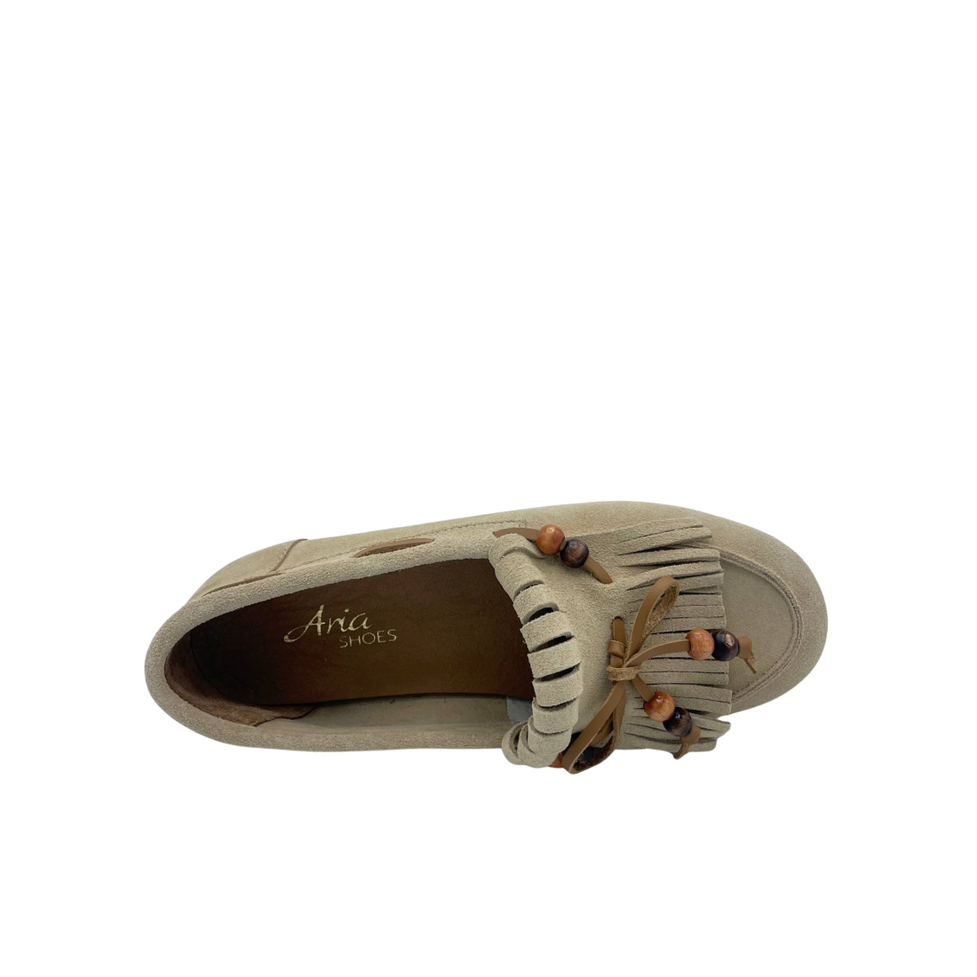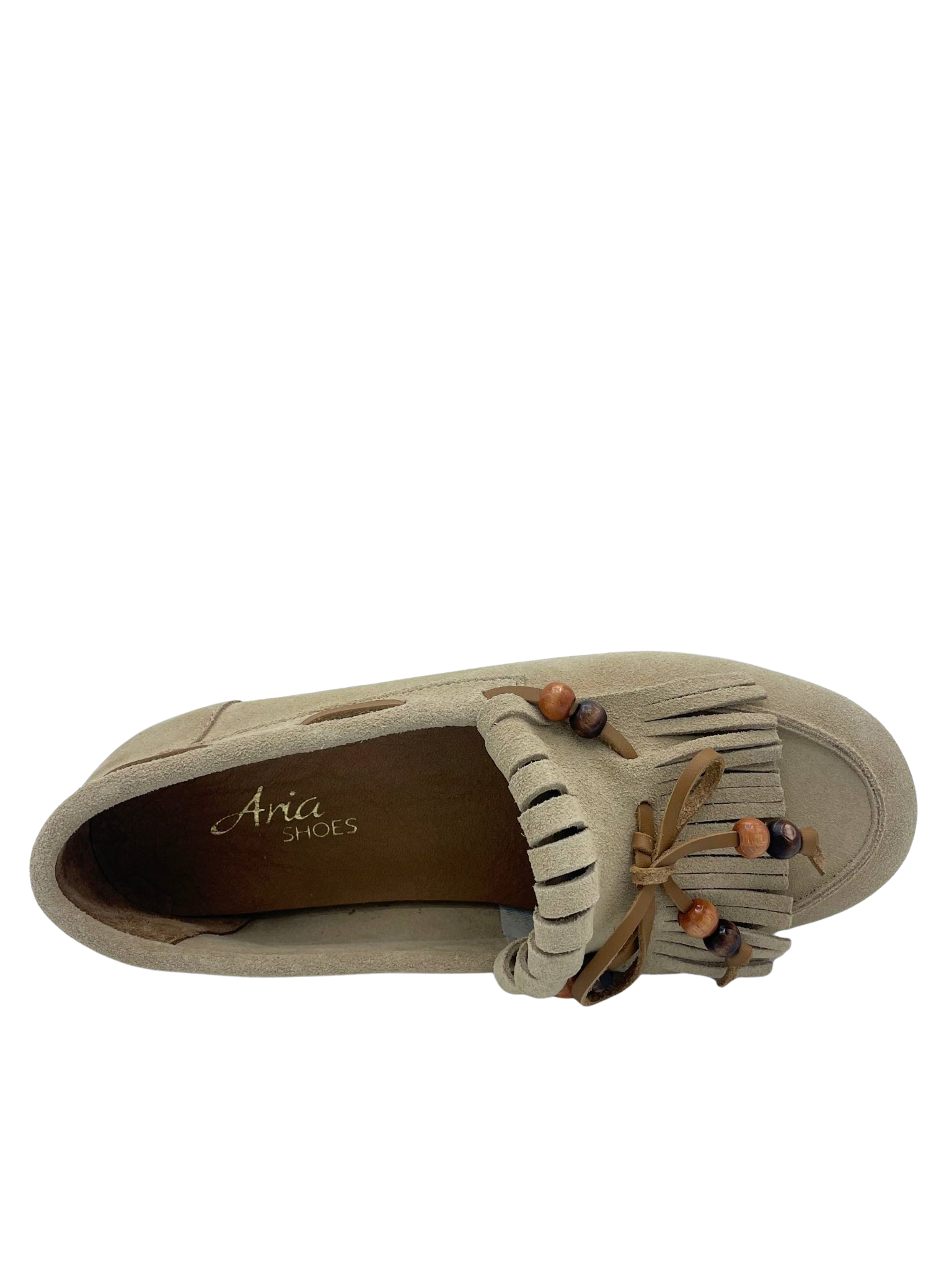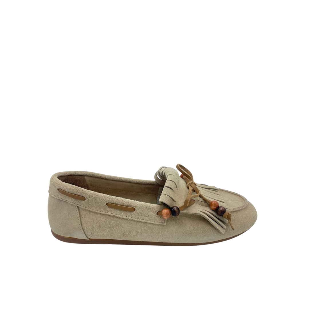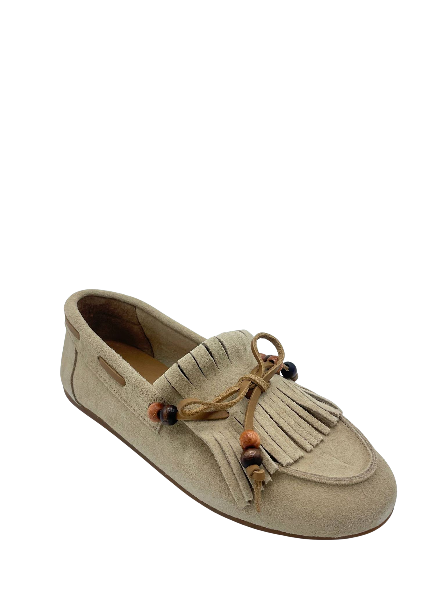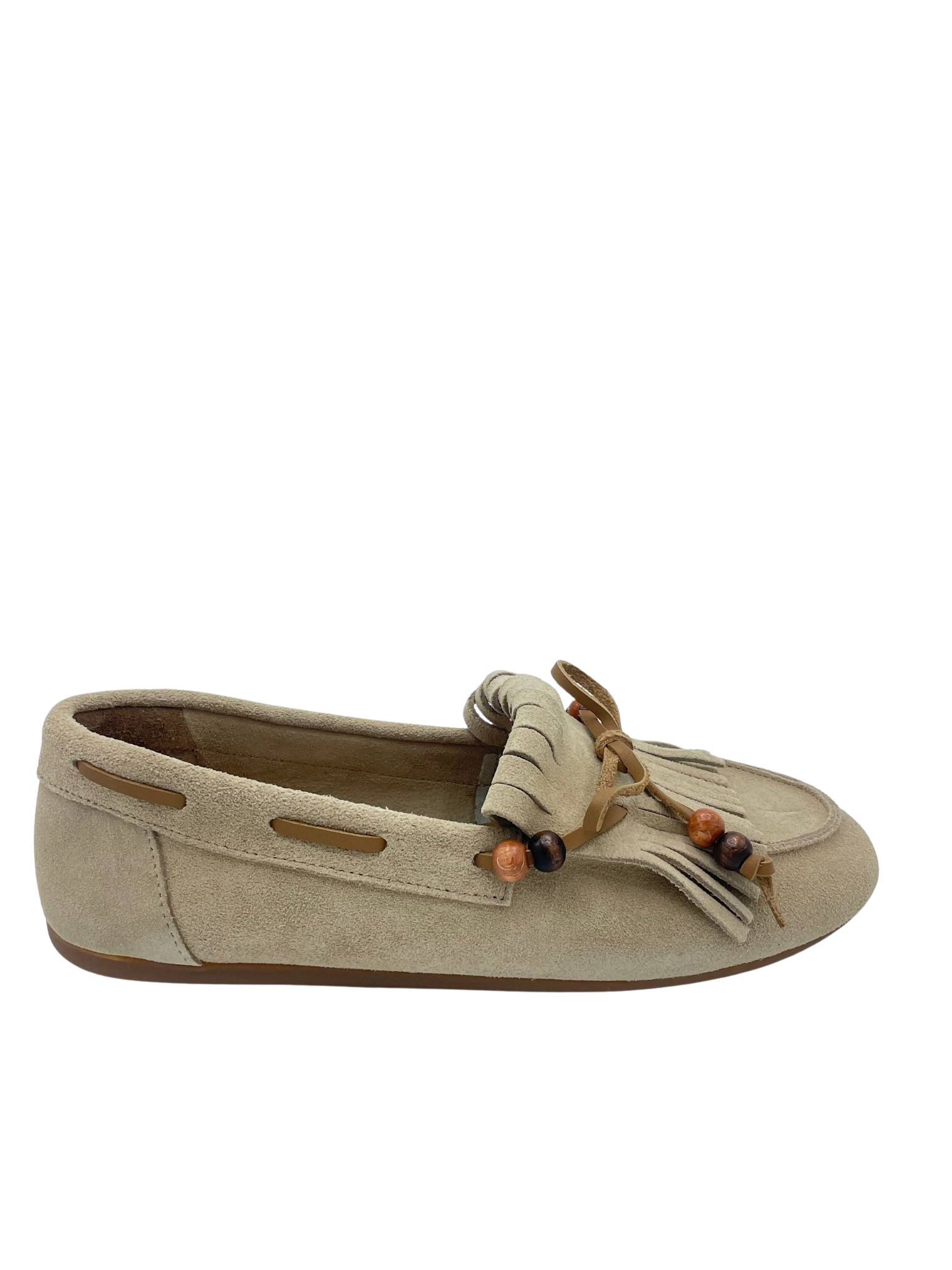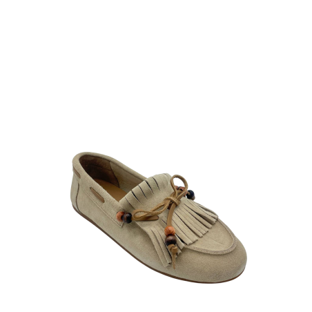 Mocassino con tomaia in vera pelle scamosciata sfoderata. Sottopiede in vera pelle. Dettaglio fiocco con perline sul davanti e frange. Fondo in gomma.