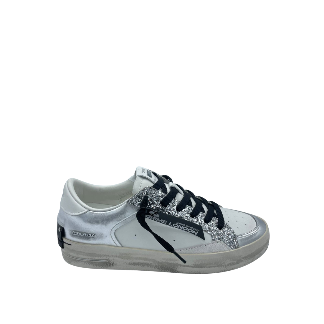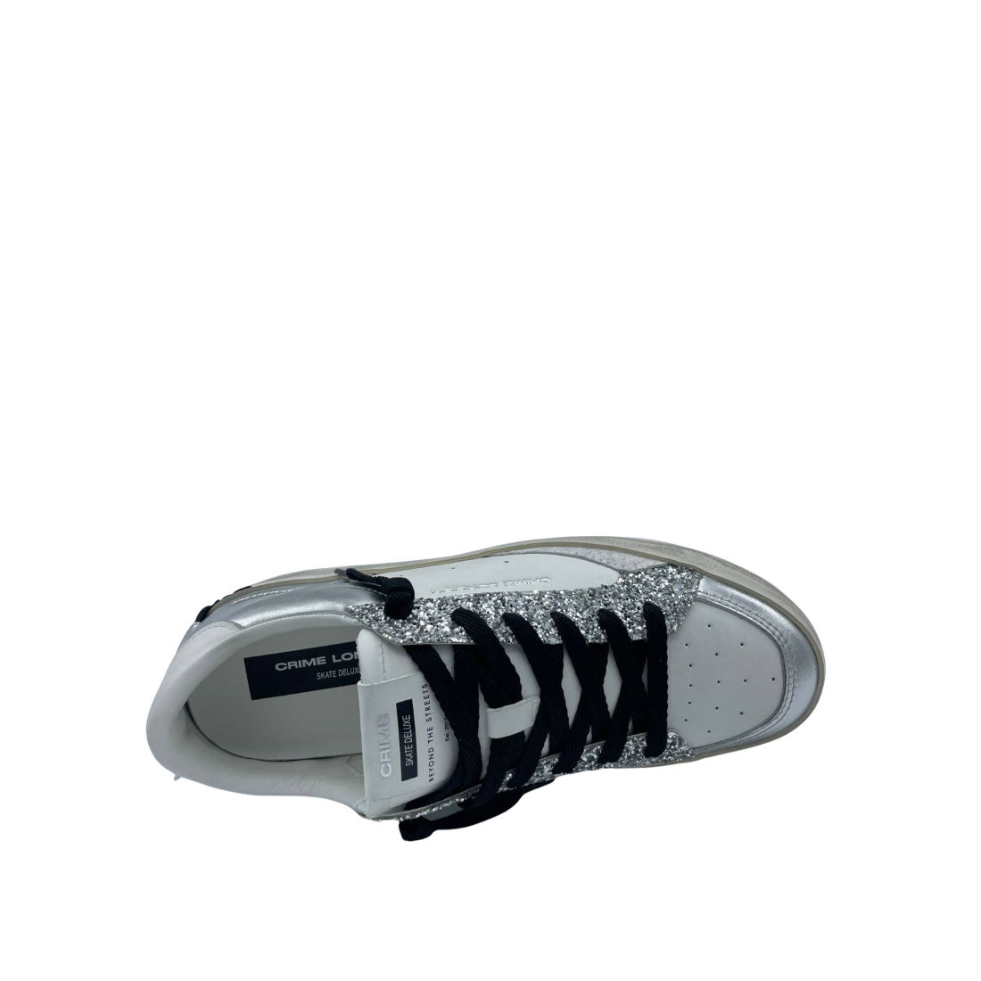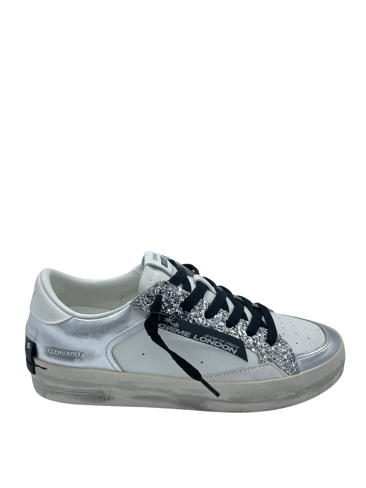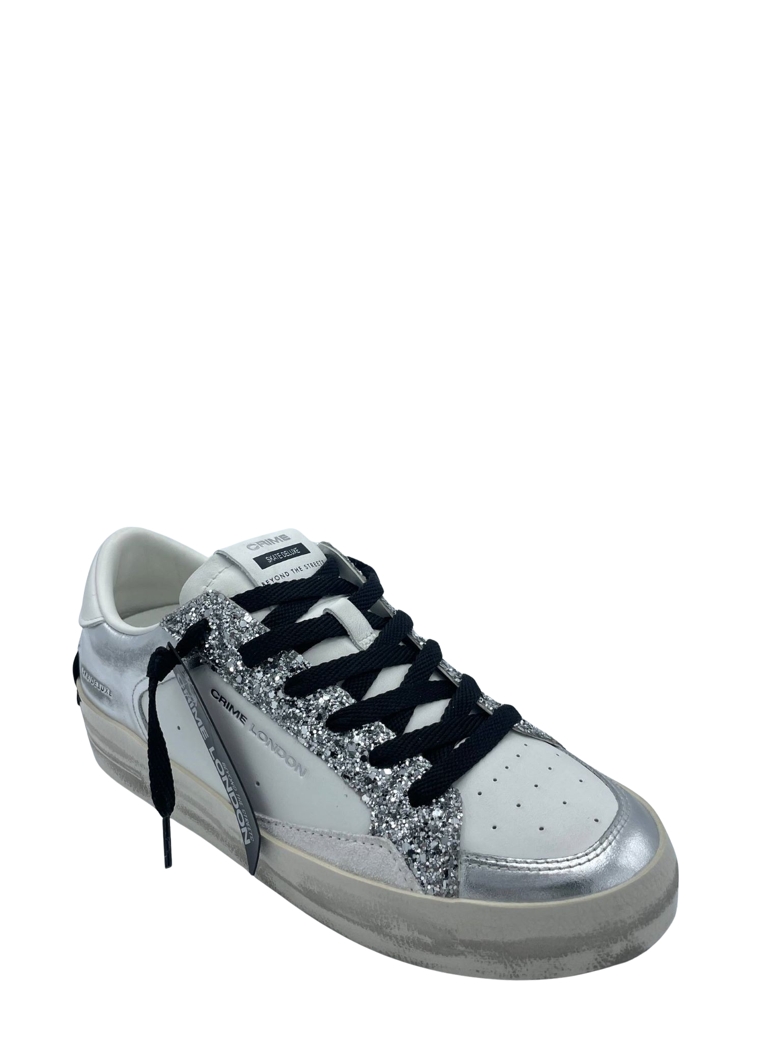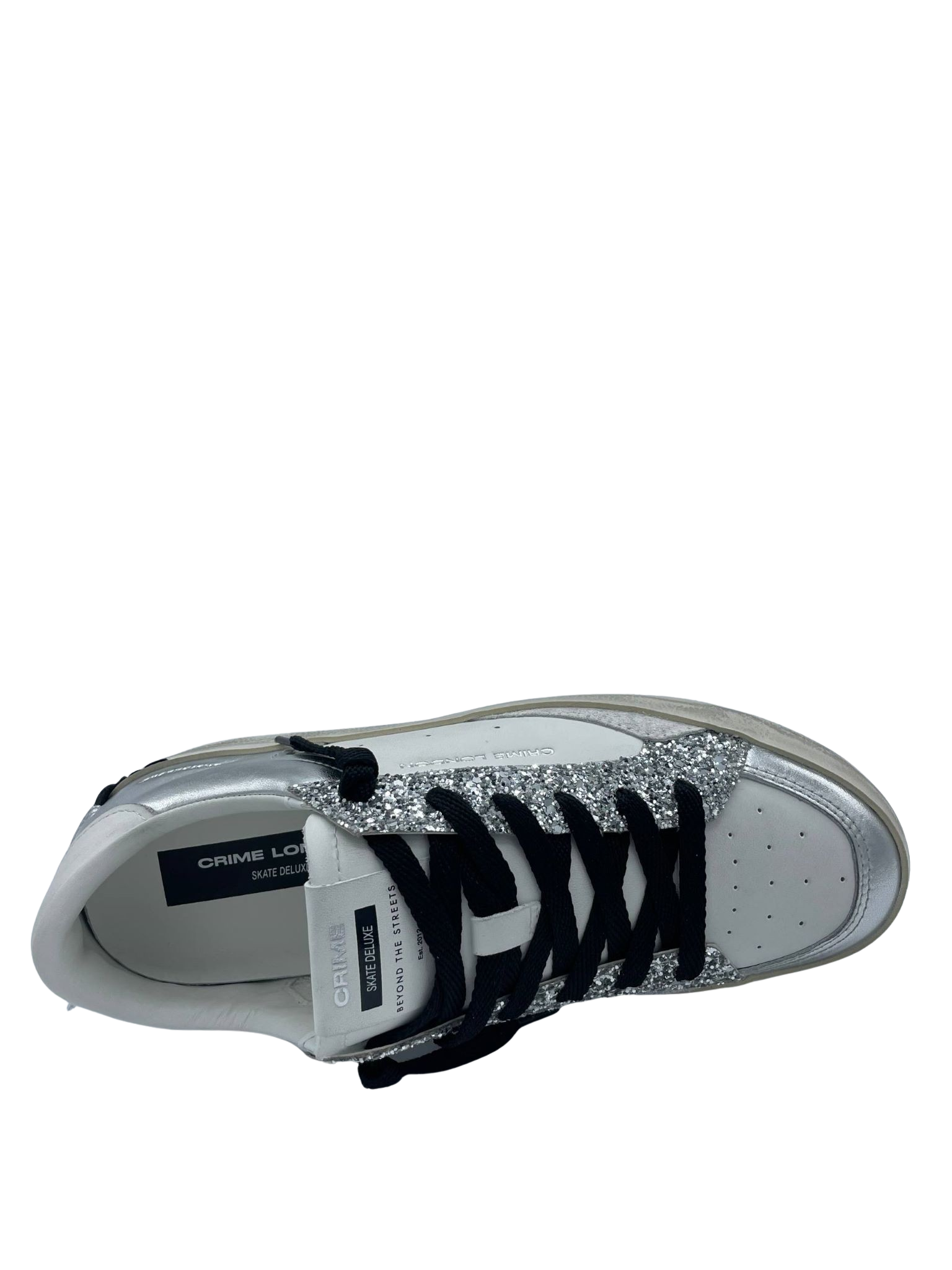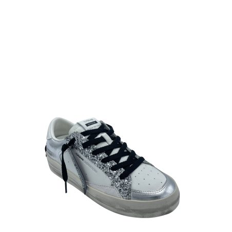 Sneaker con tomaia realizzata in vera pelle con lacci. Dettaglio glitter argento. Sottopiede in tessuto e fondo in gomma. Made in Italy.