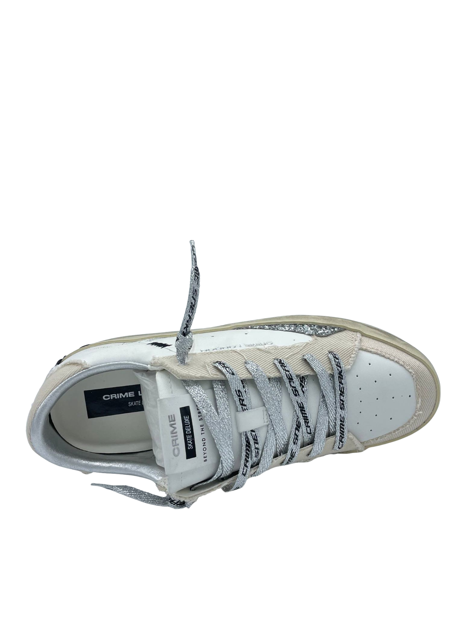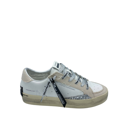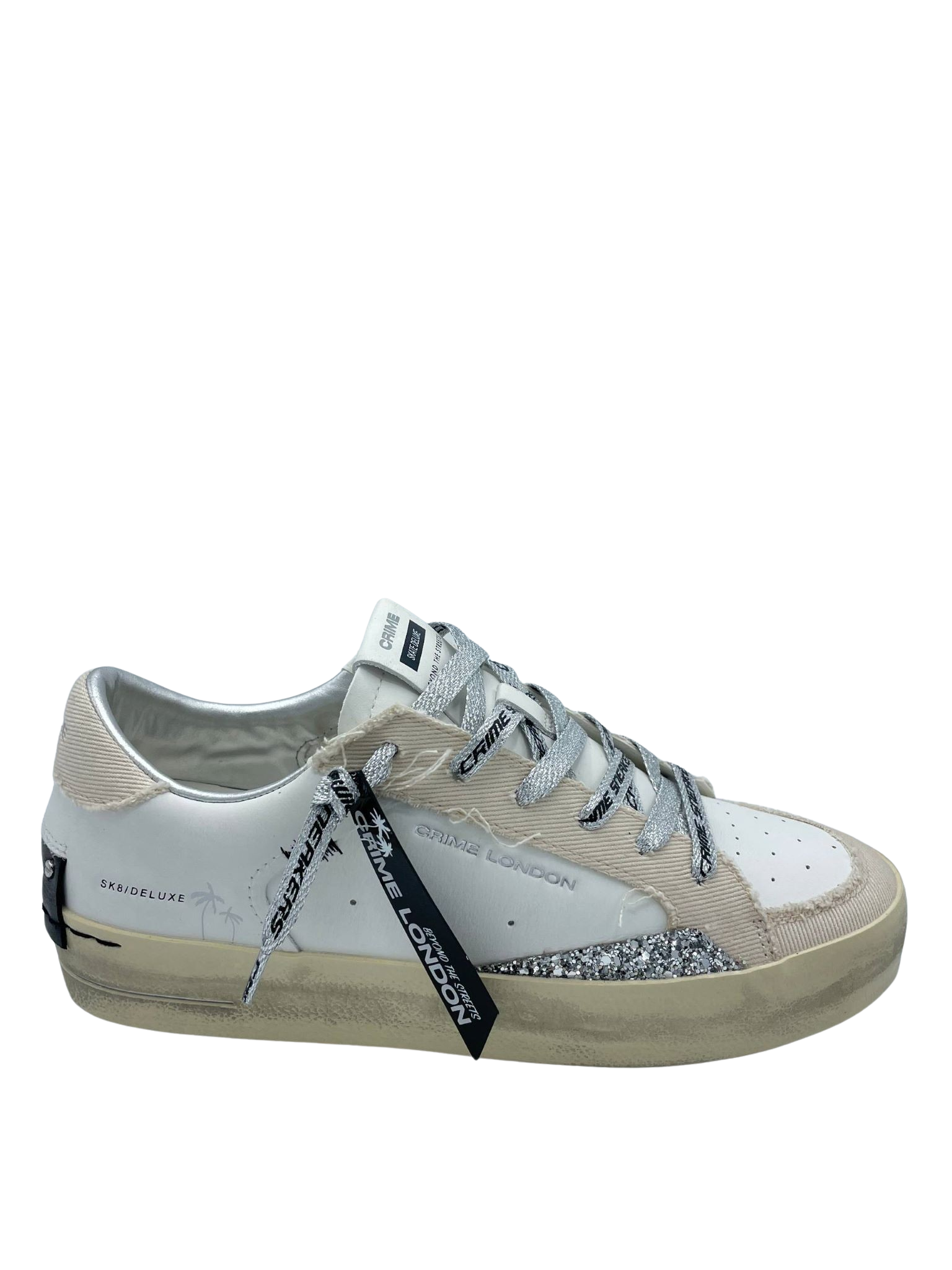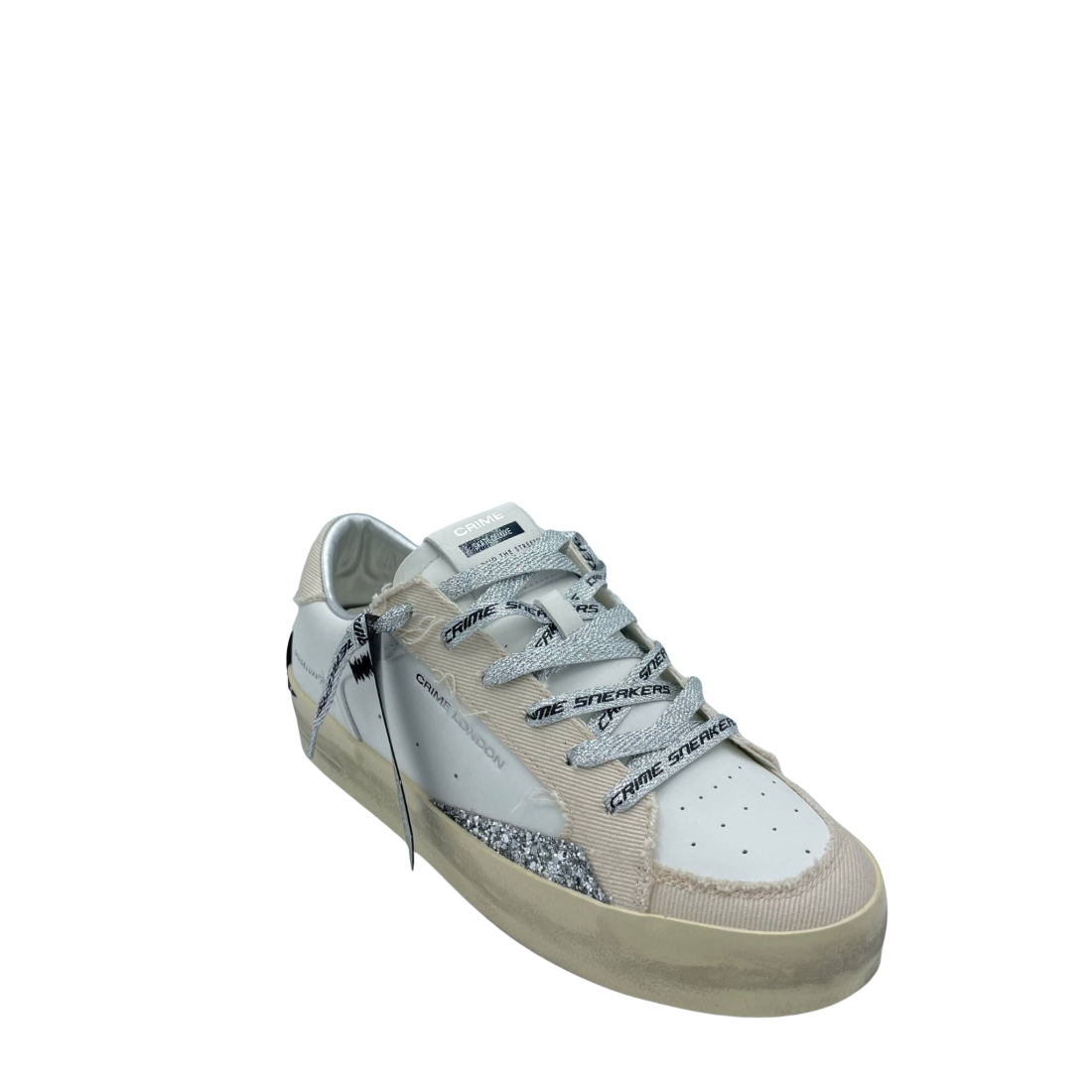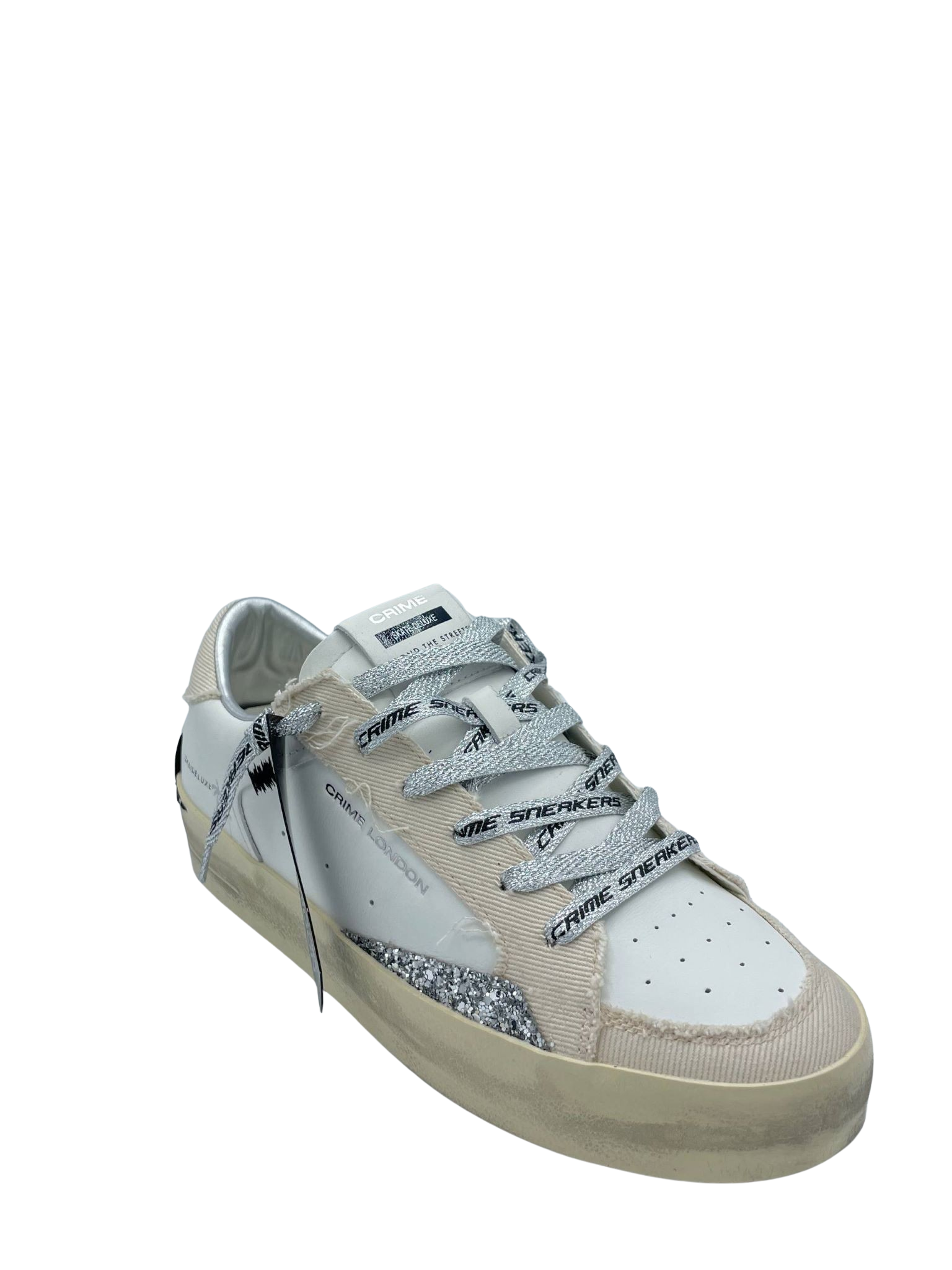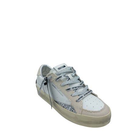 Sneaker con tomaia realizzata in vera pelle, con lacci logati e sottopiede in tessuto. Dettaglio glitter argento laterale. Fondo in gomma. Made in Italy.