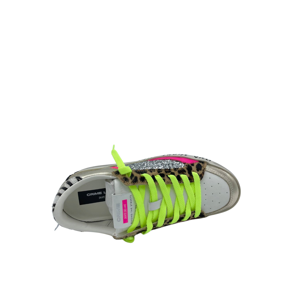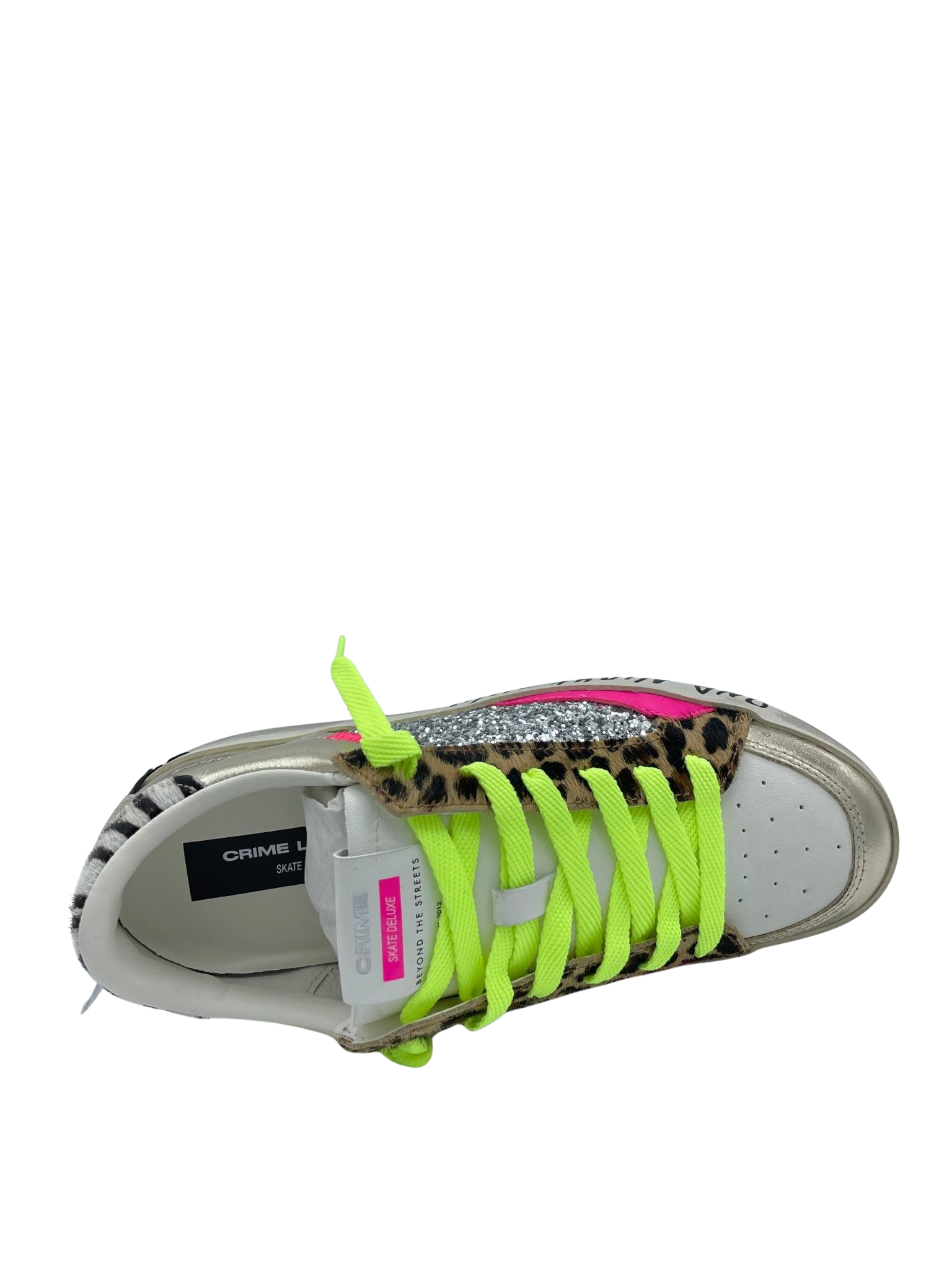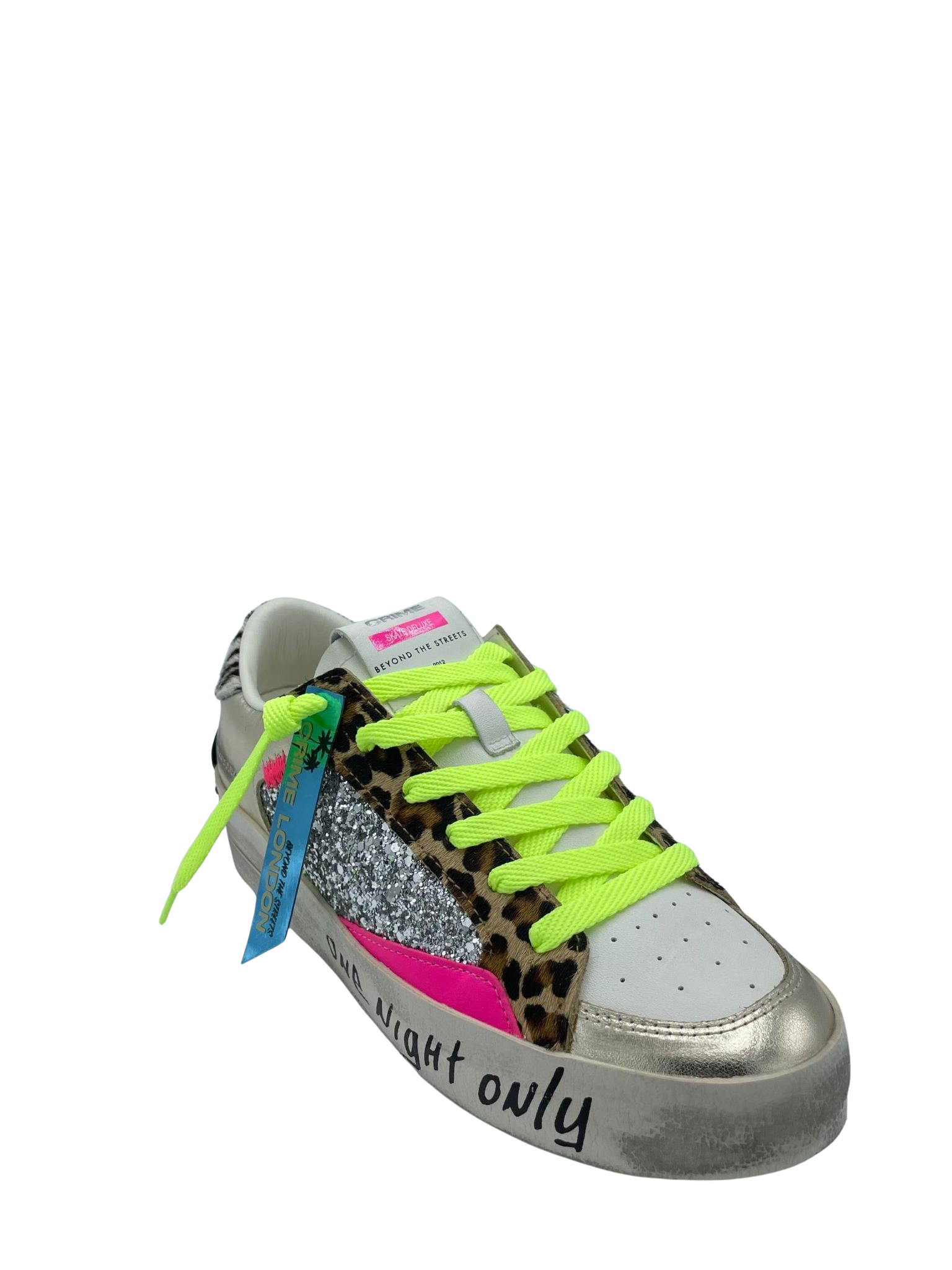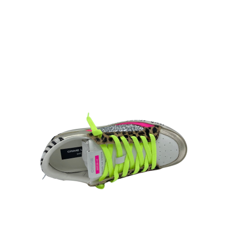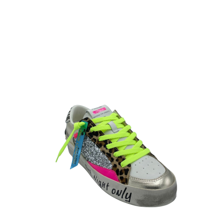 Sneaker con tomaia realizzata in vera pelle con dettaglio leopardato e glitter argento. Sottopiede in tessuto e lacci fluo a contrasto. Fondo in gomma. Made in Italy.
