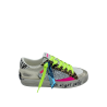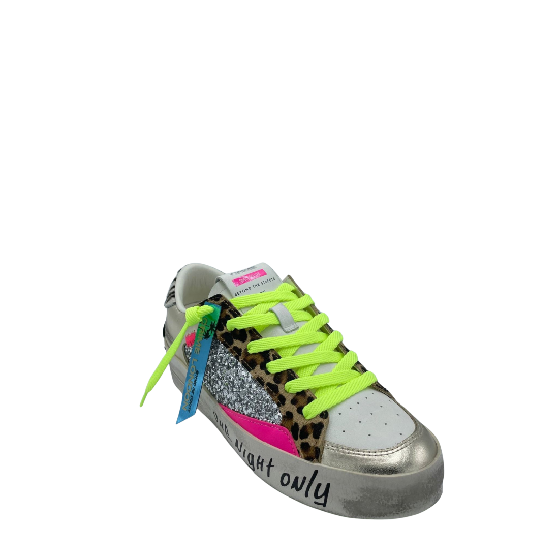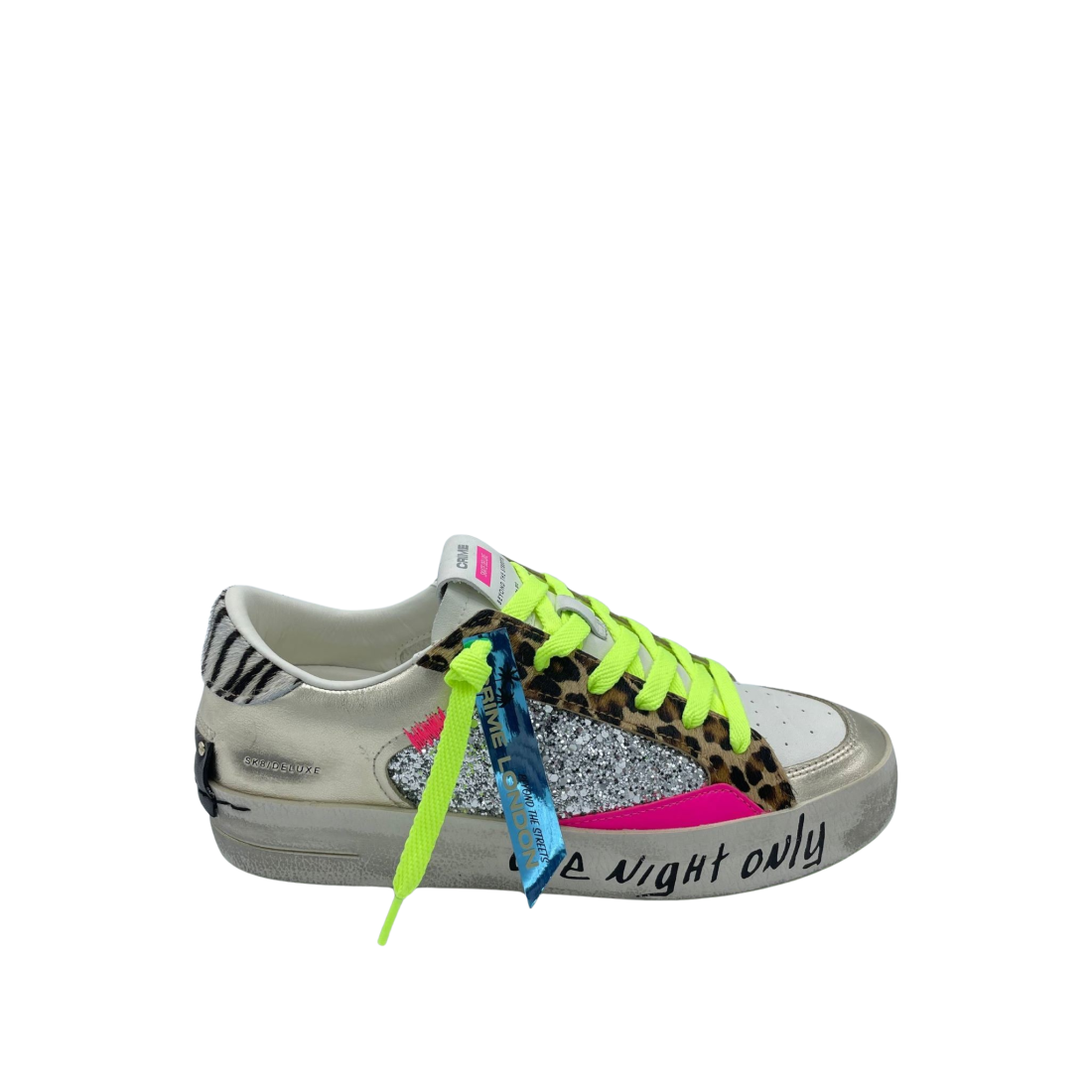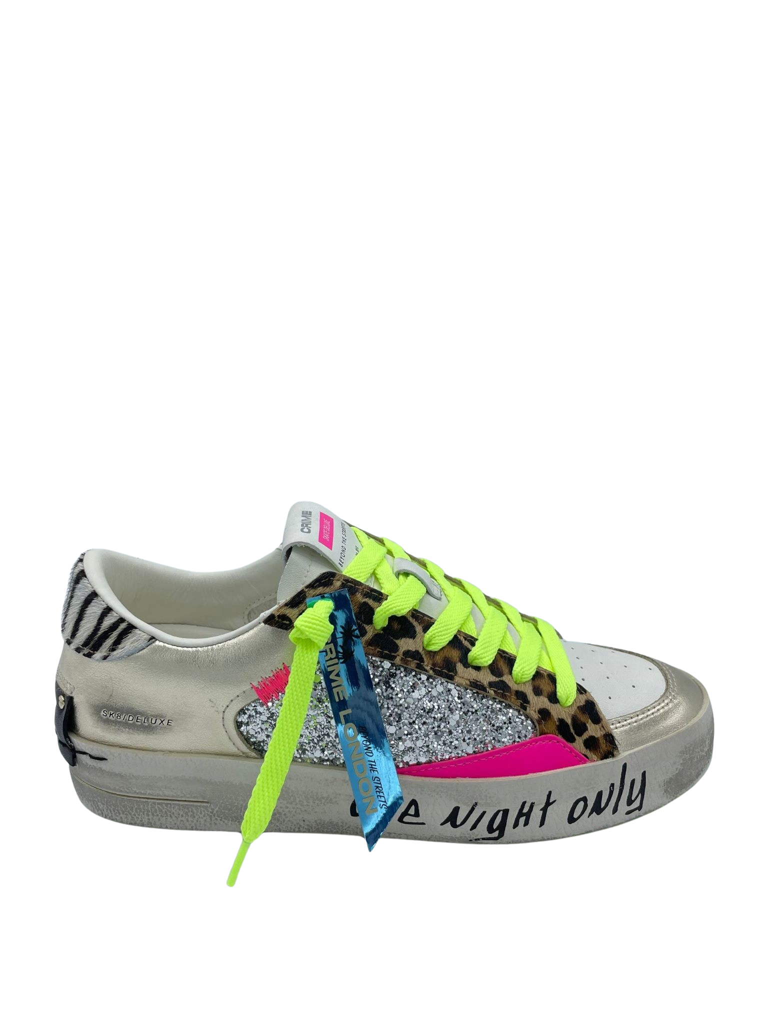 Sneaker con tomaia realizzata in vera pelle con dettaglio leopardato e glitter argento. Sottopiede in tessuto e lacci fluo a contrasto. Fondo in gomma. Made in Italy.