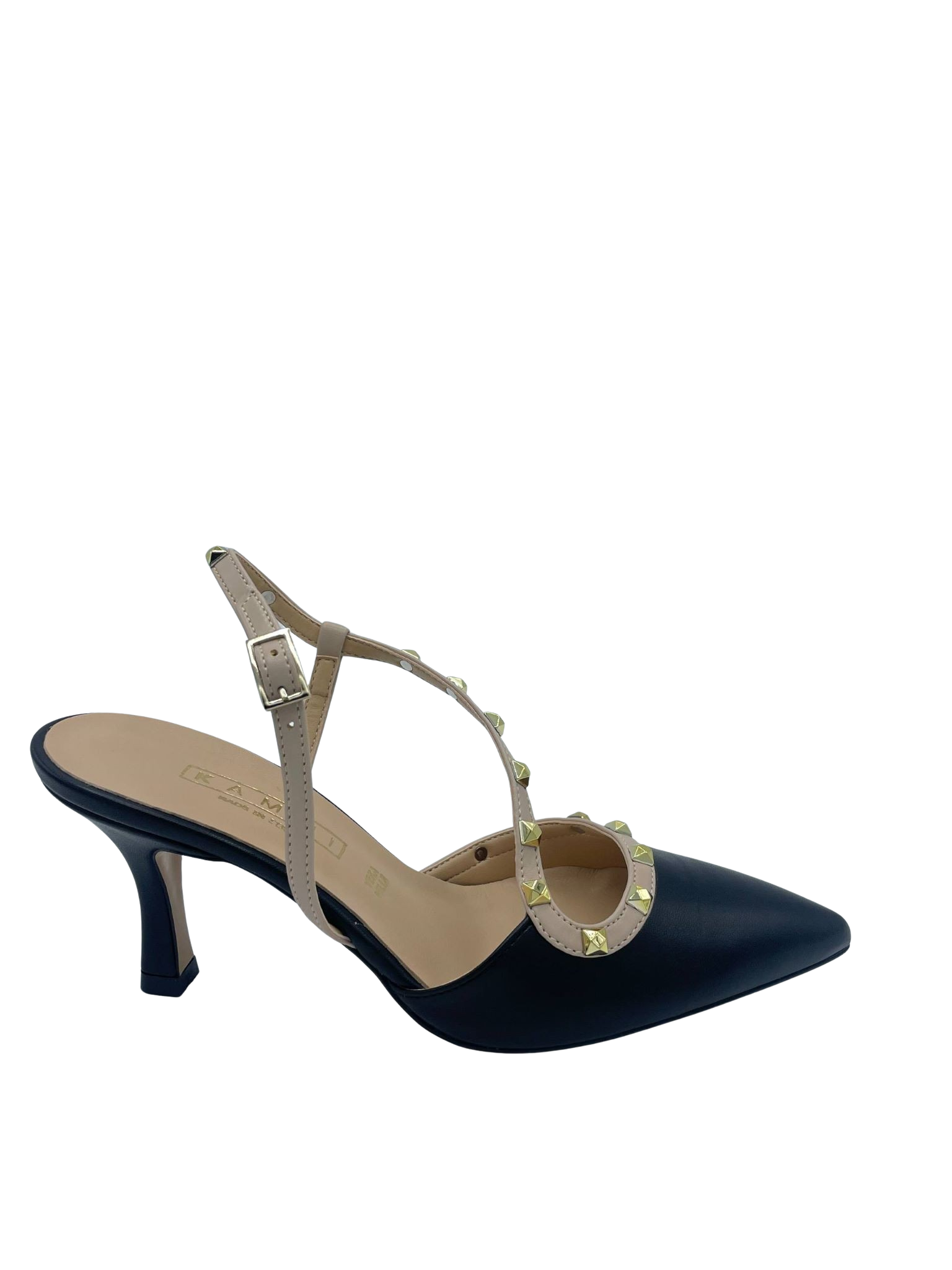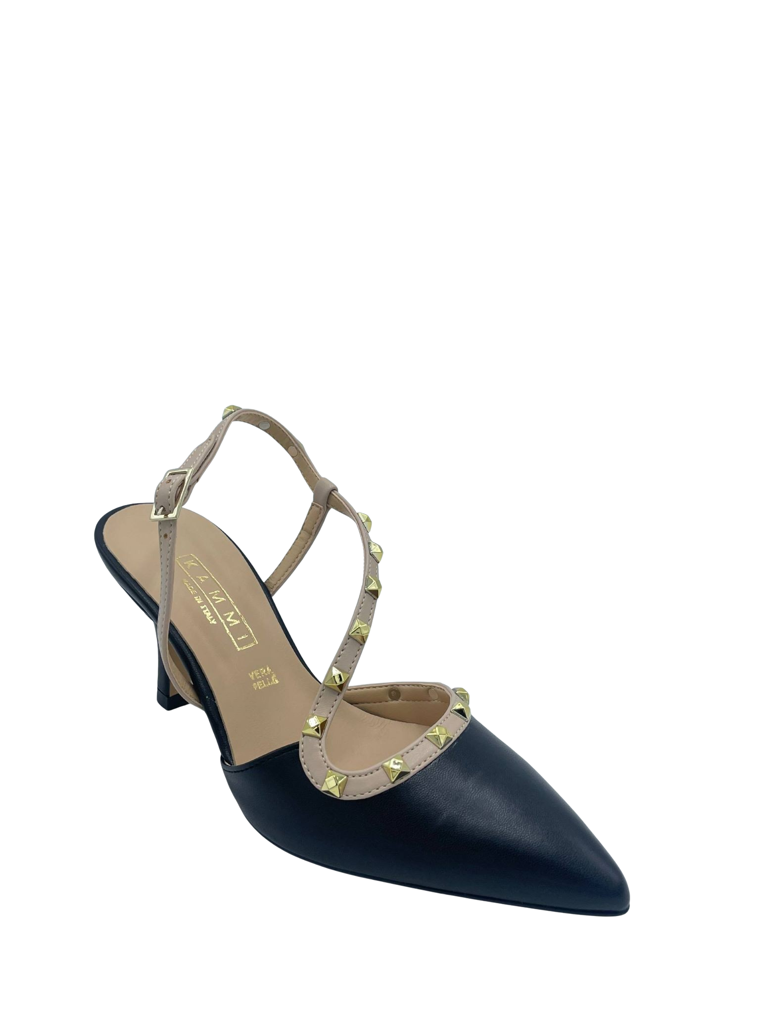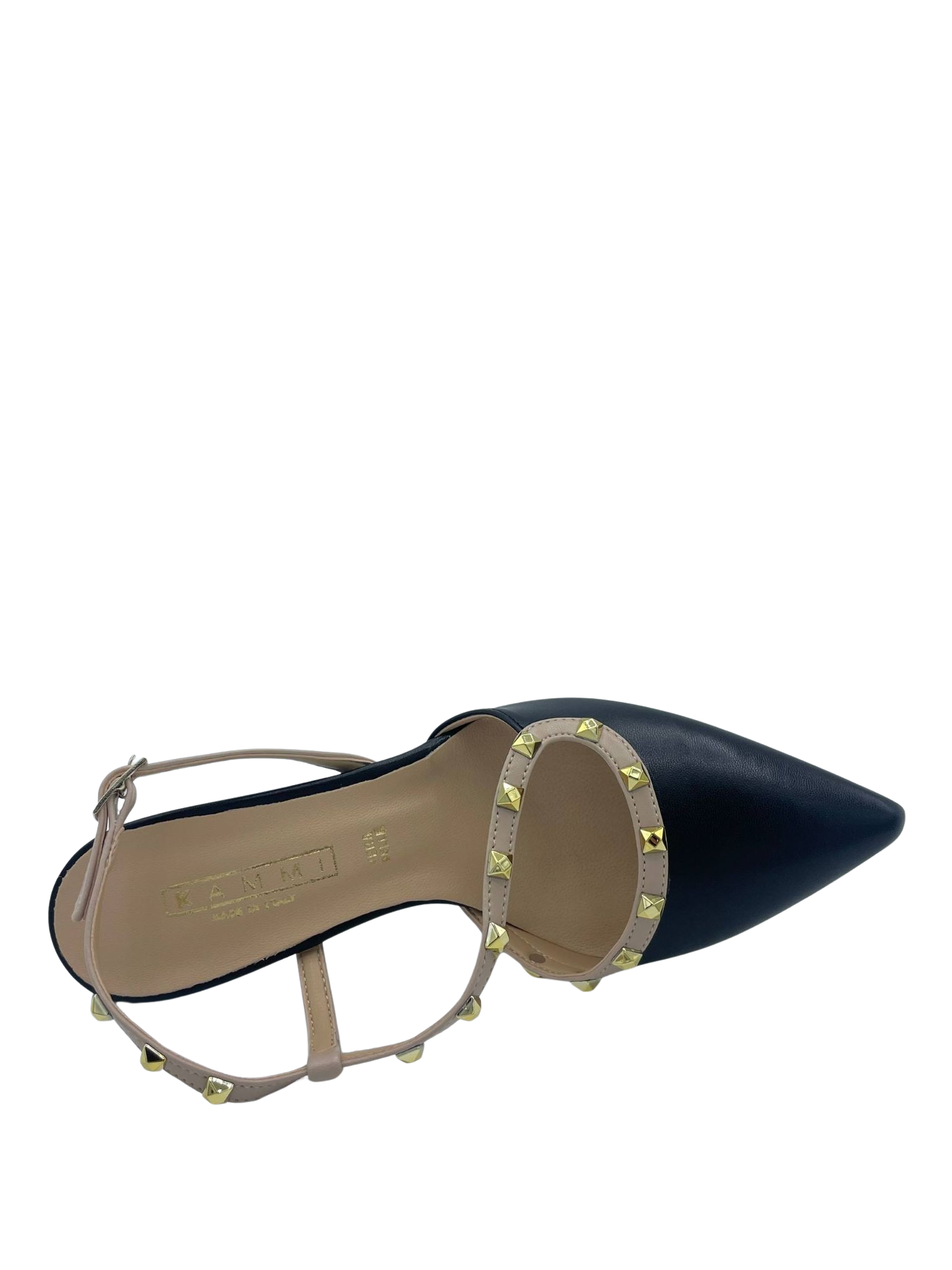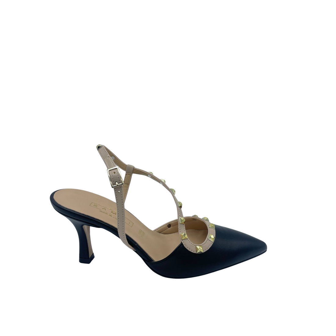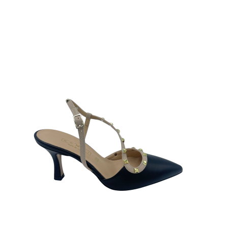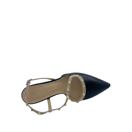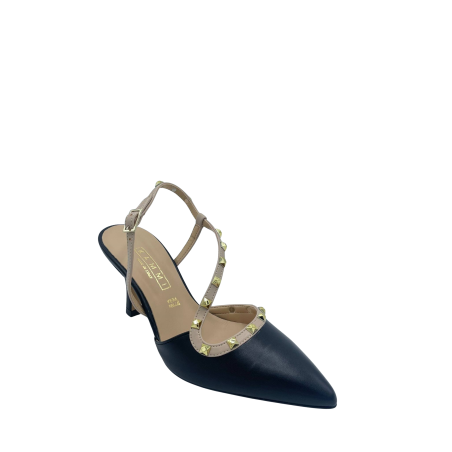 Slingback con tomaia in ecopelle e sottopiede in vera pelle, con cinturino obliquo regolabile . Dettaglio borchie oro. Tacco alto 7 cm. Fondo in tunit. Made in Italy e lavorazione artigianale.