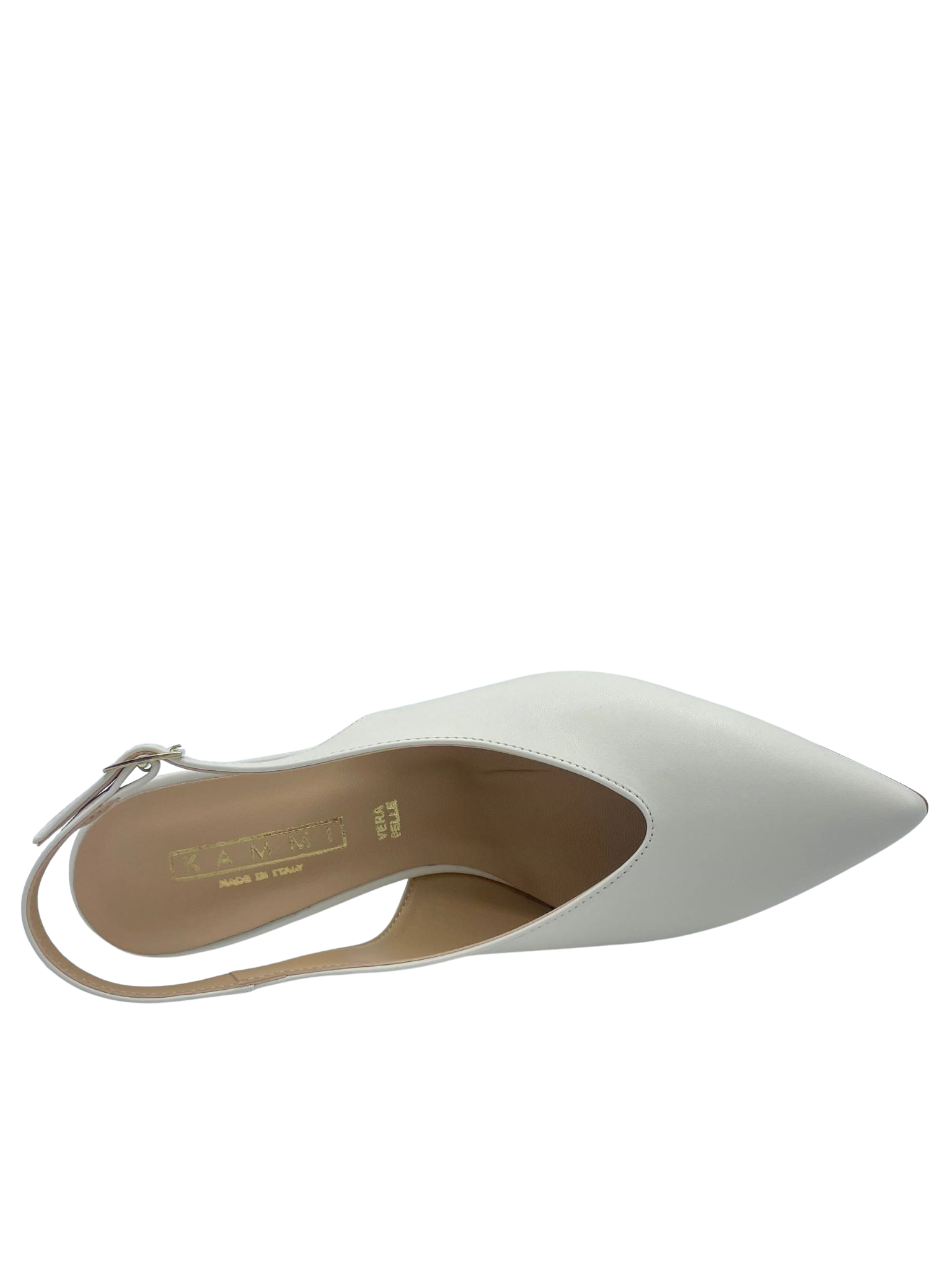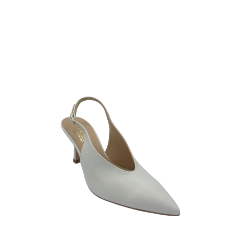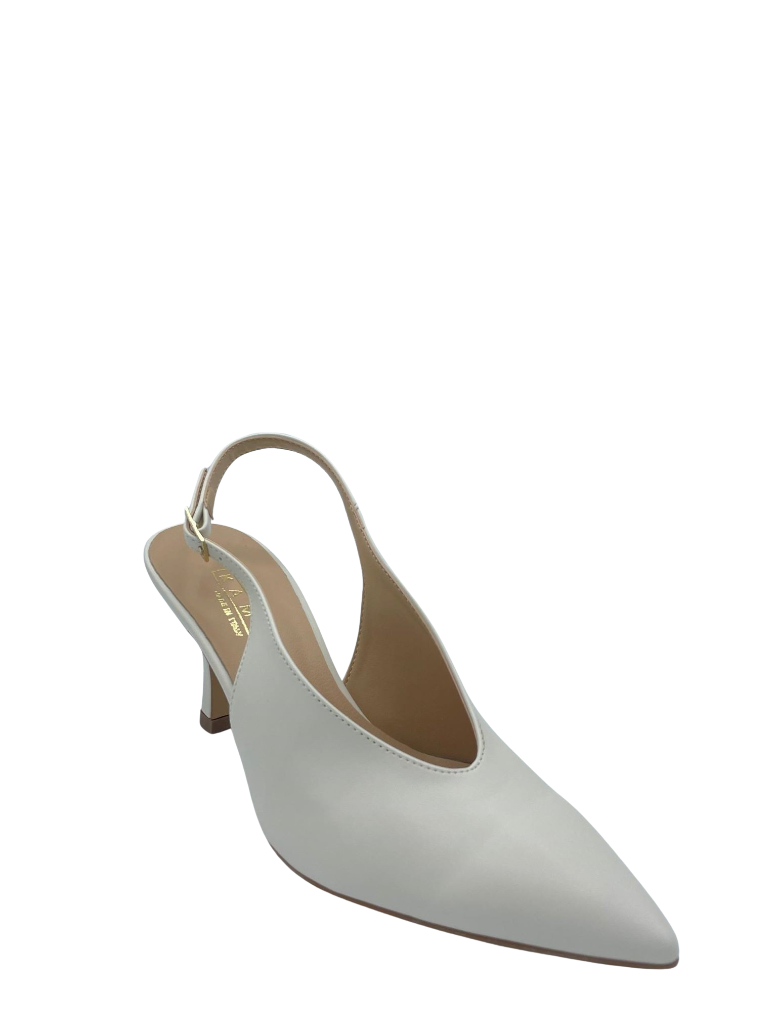 Slingback tomaia in ecopelle e sottopiede in vera pelle, accollata con scollo a V e cinturino regolabile. Fondo tunit. Made in Italy e lavorazione artigianale.