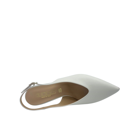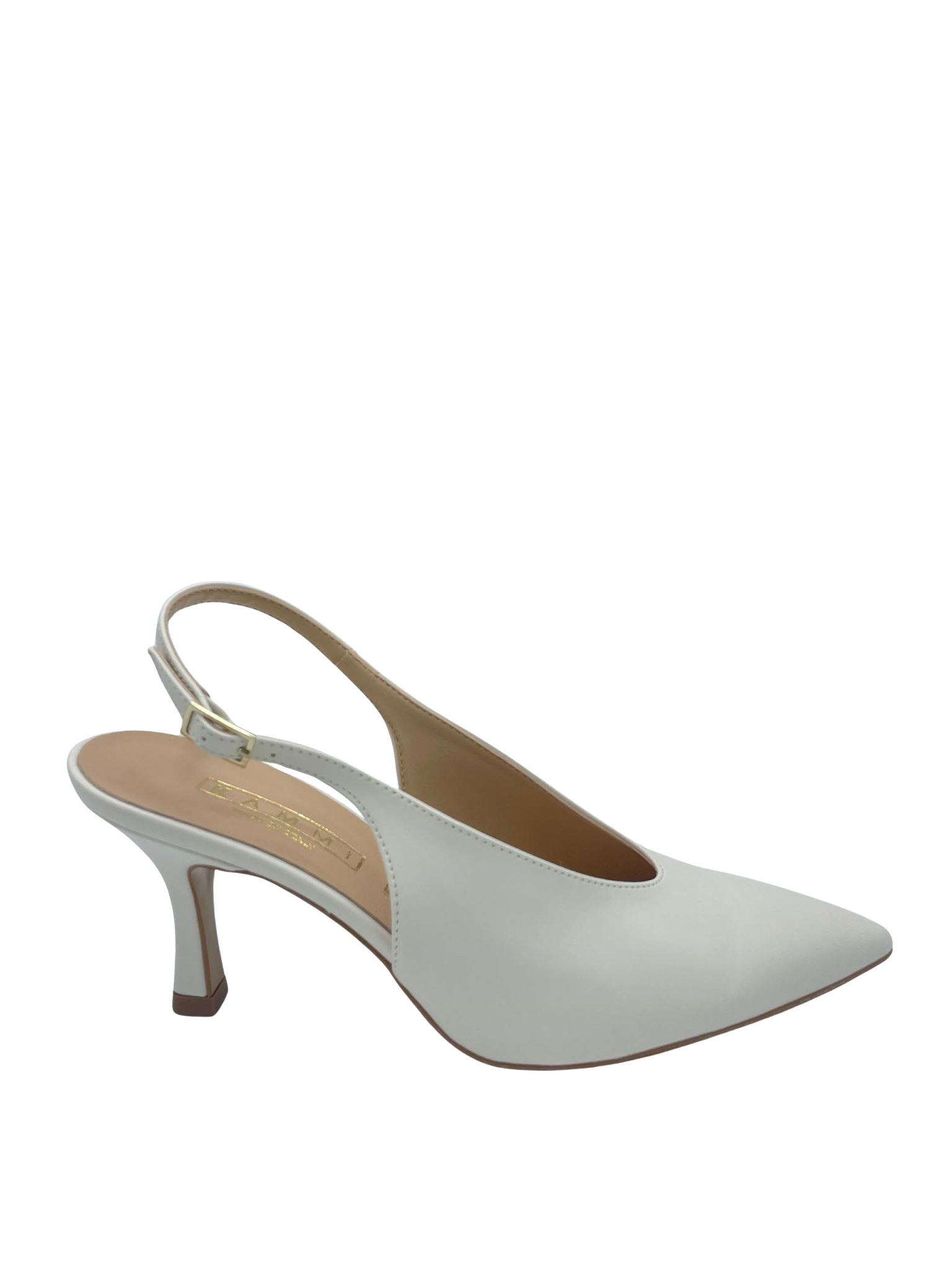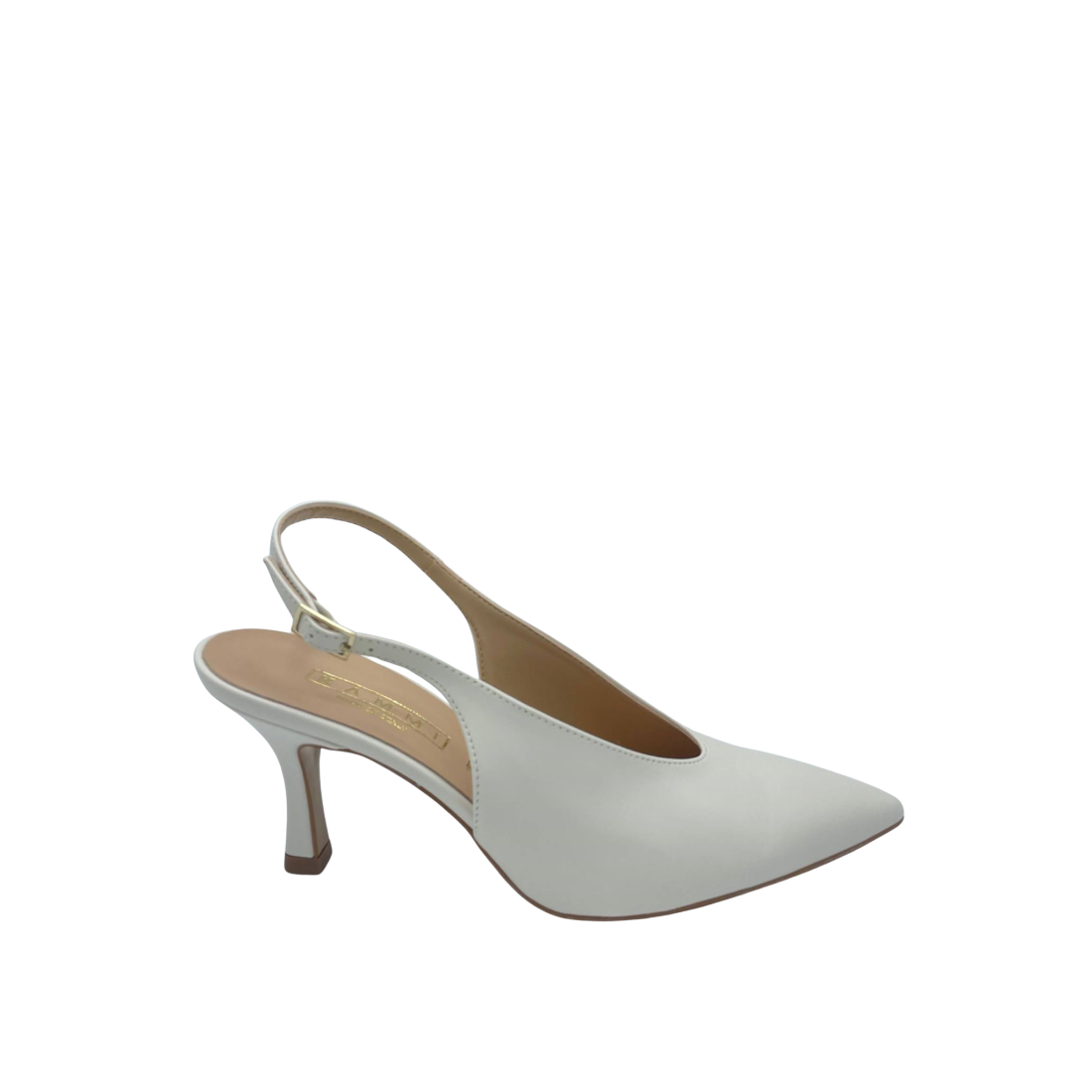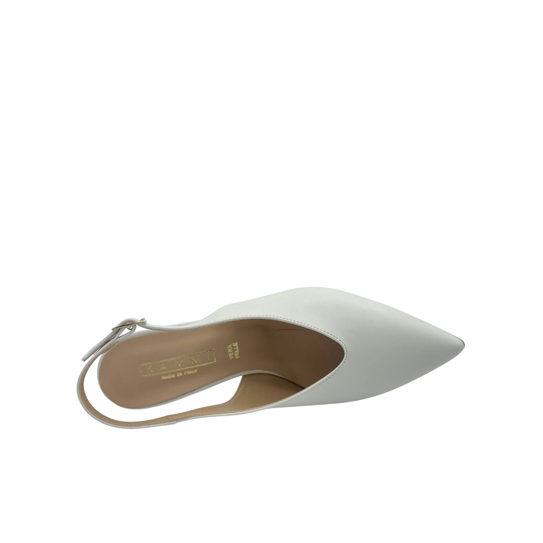 Slingback tomaia in ecopelle e sottopiede in vera pelle, accollata con scollo a V e cinturino regolabile. Fondo tunit. Made in Italy e lavorazione artigianale.