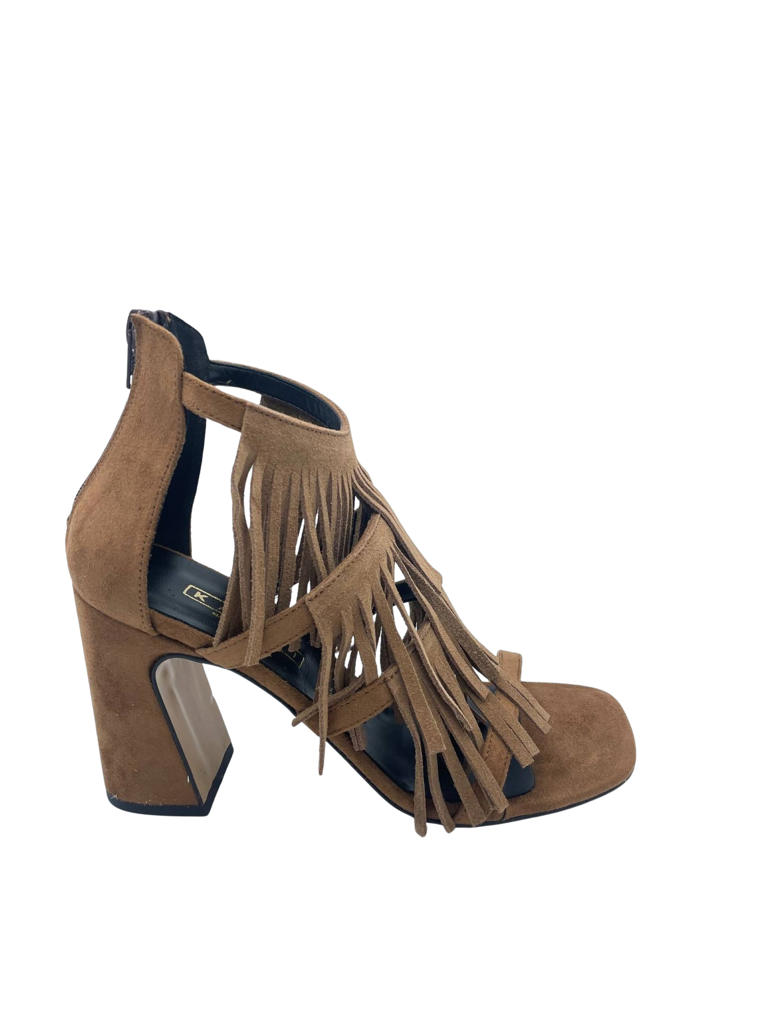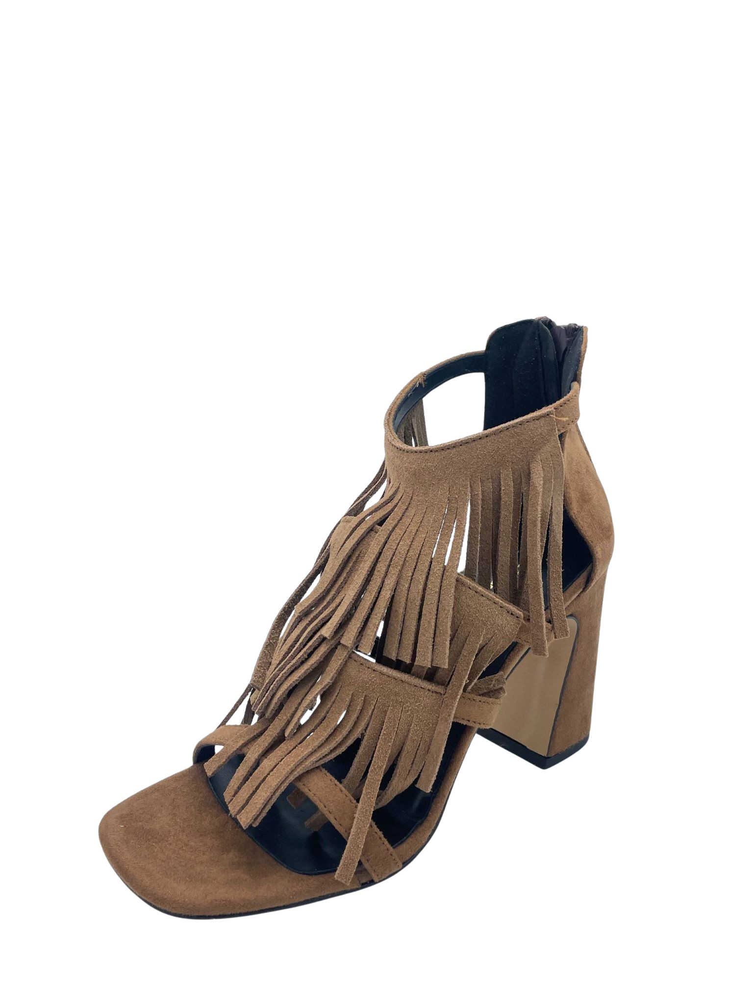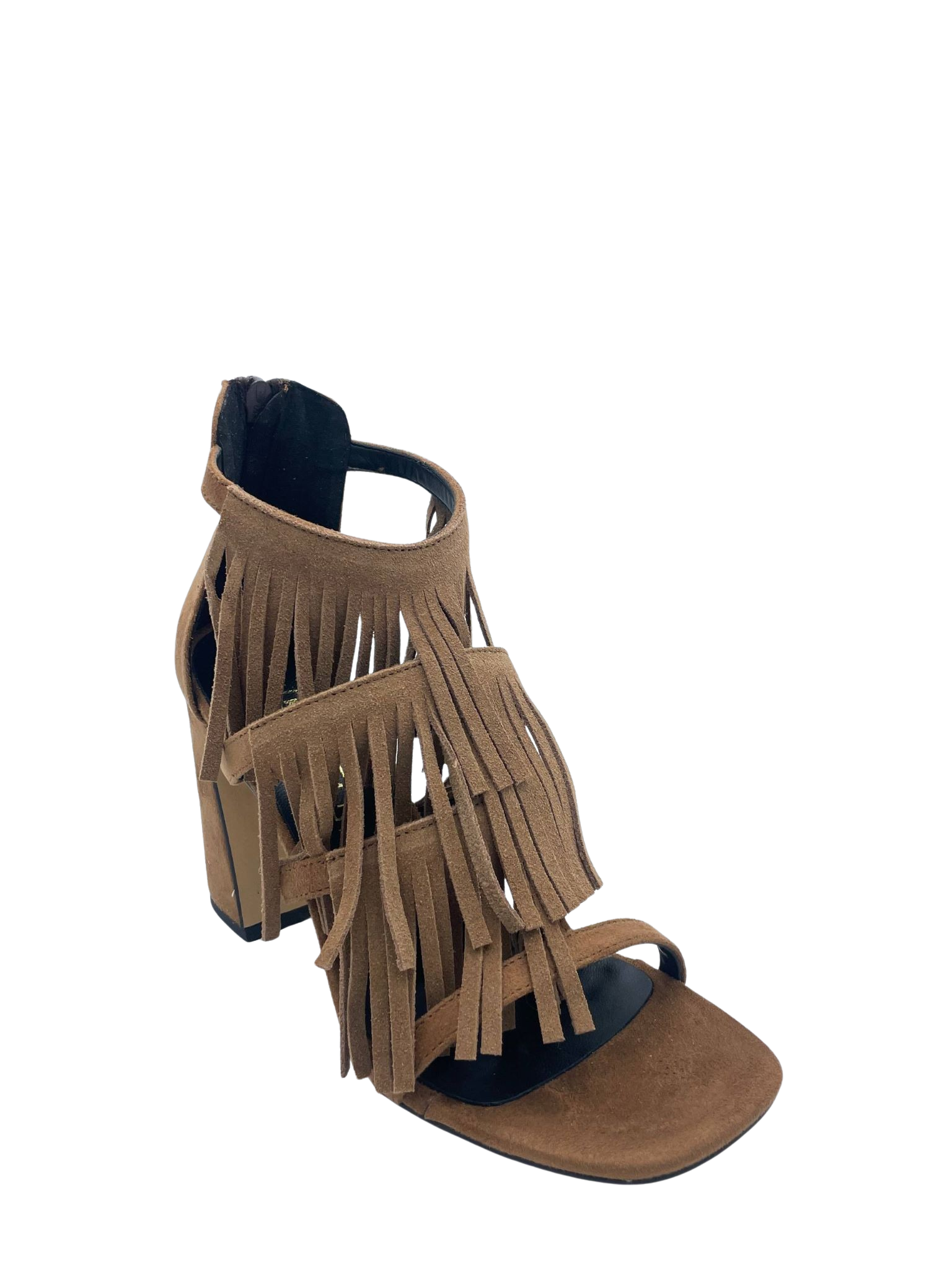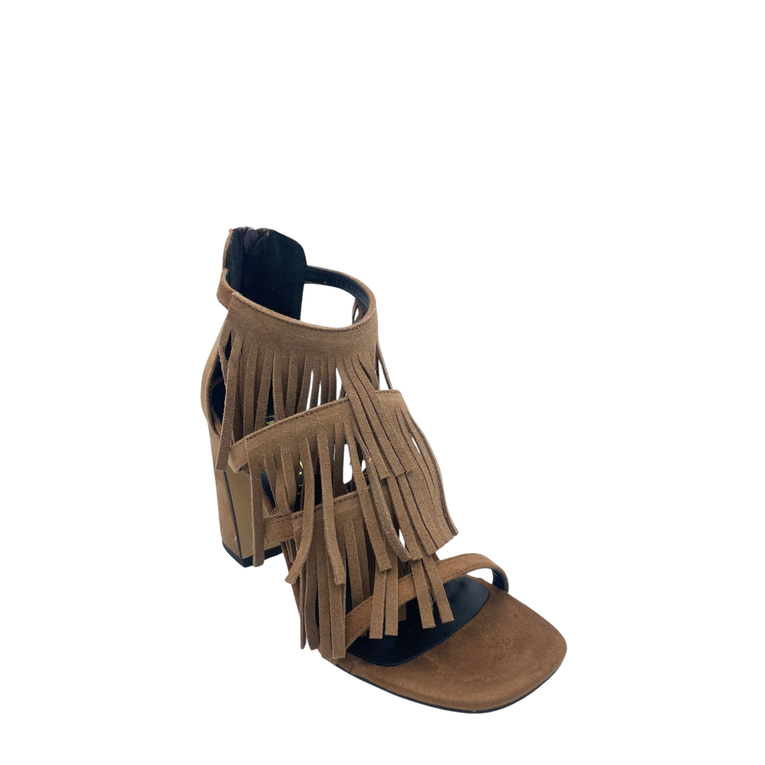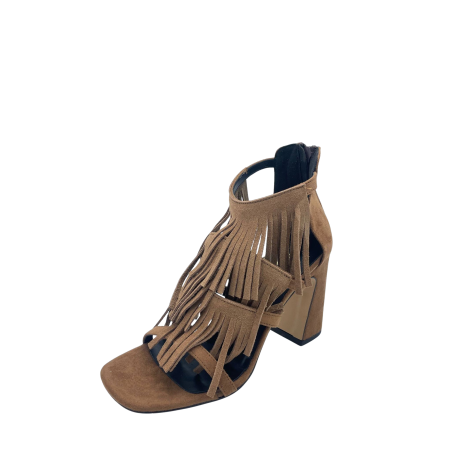 Sandalo squadrato con tomaia in ecopelle effetto suede con frange. Sottopiede in vera pelle. Tacco largo alto 8.5 cm e chiusura sul tallone con cerniera. Fondo in tunit. Made in Italy e lavorazione artigianale.