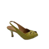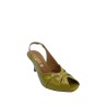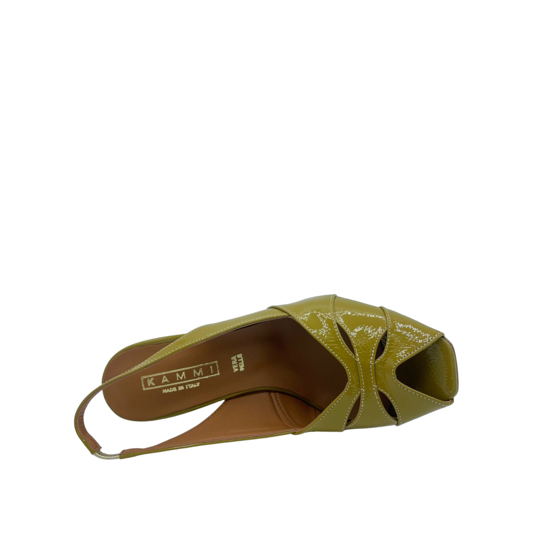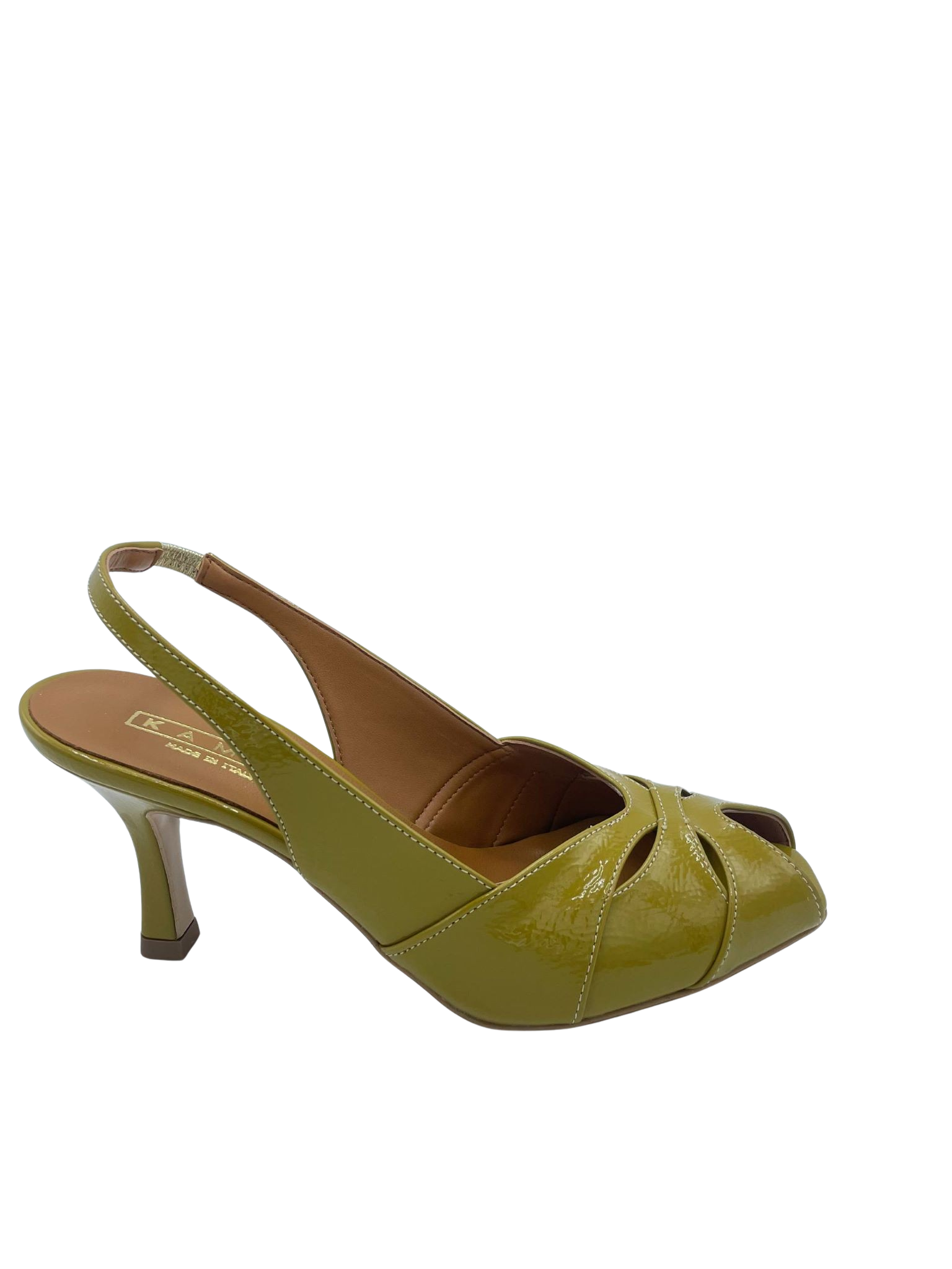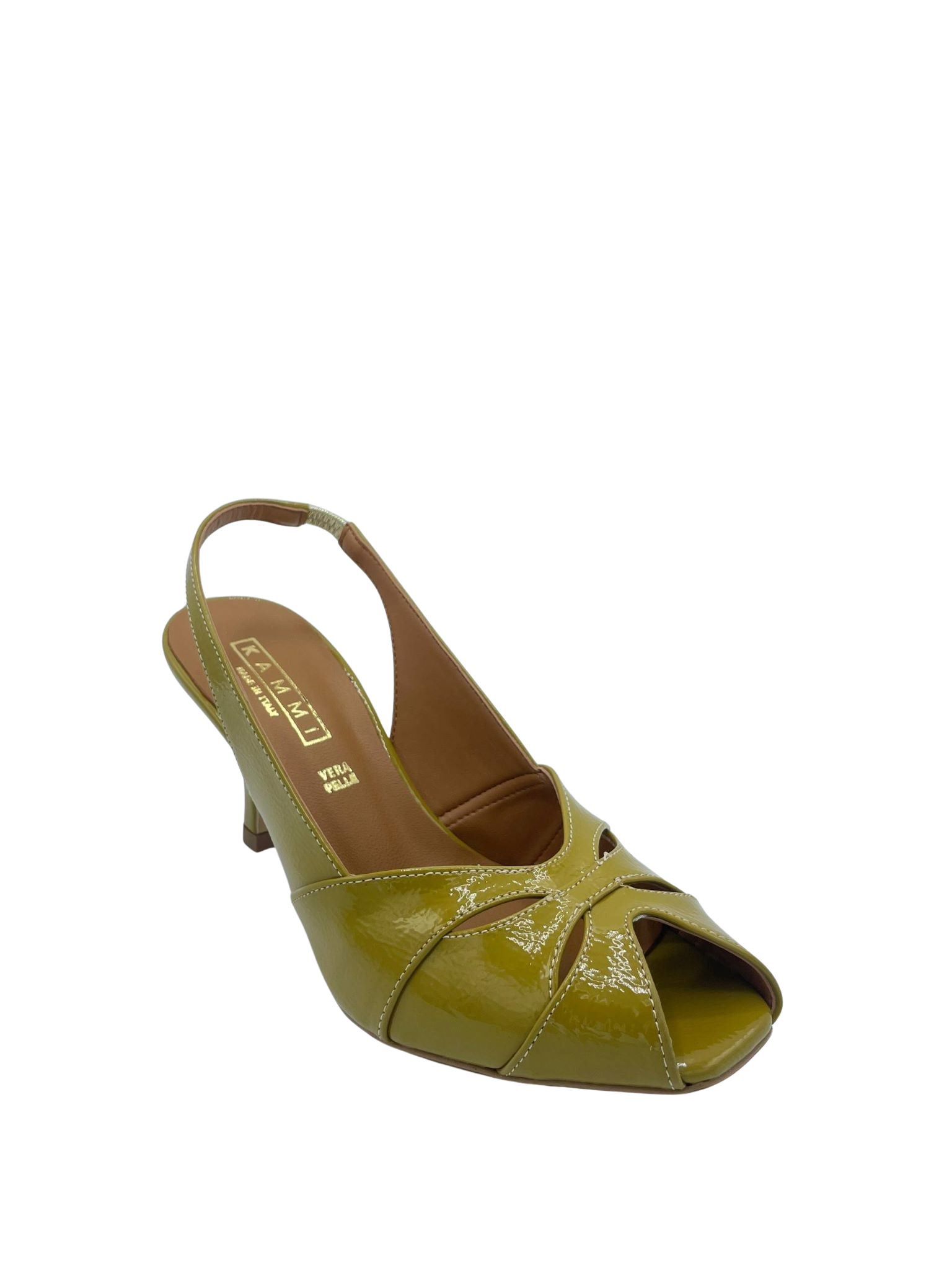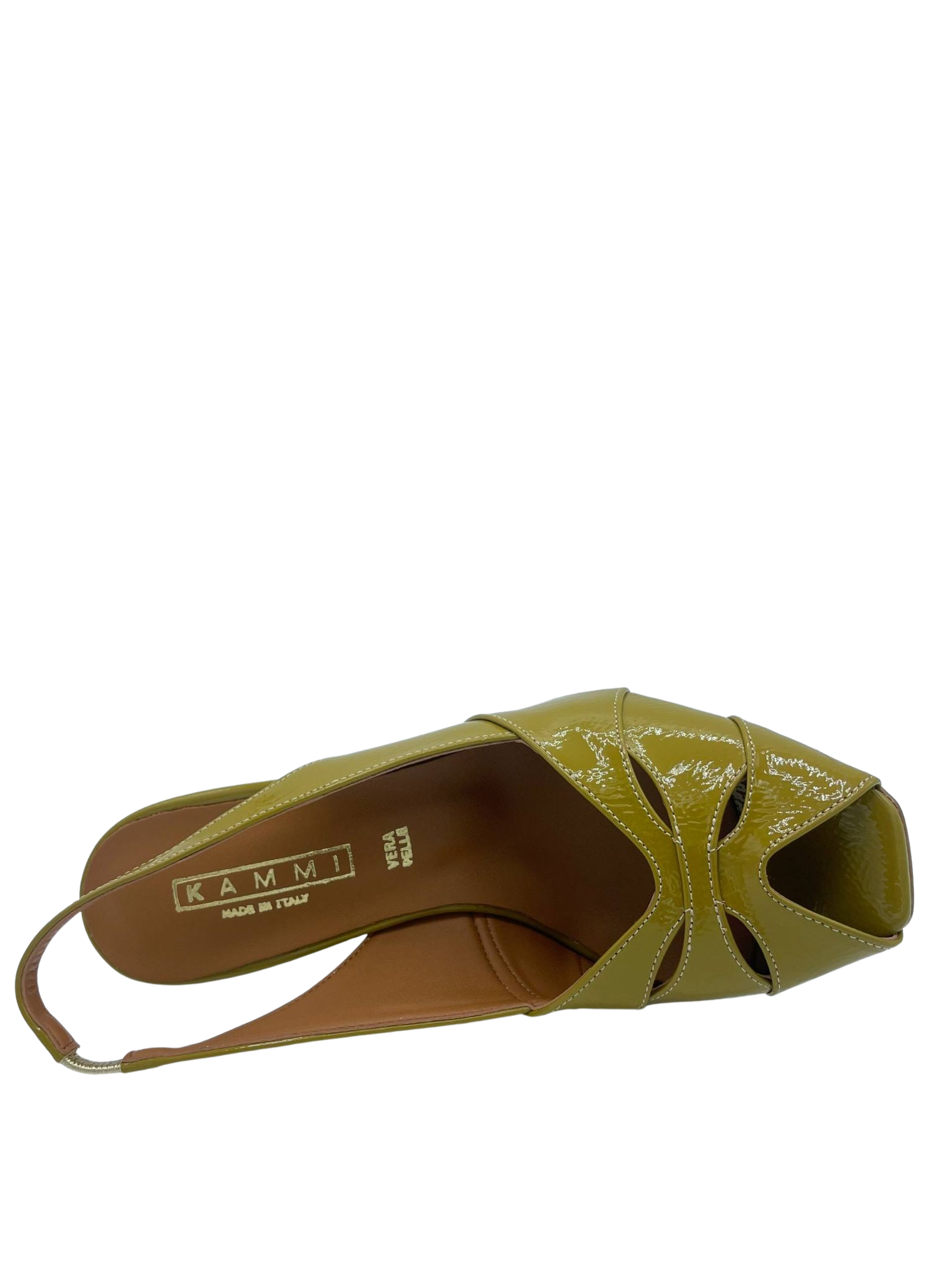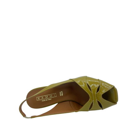 Sandalo con tomaia in ecopelle effetto vernice, cinturino elasticizzato. Sottopiede in vera pelle e tacco alto 6 cm. Fondo in tunit. Made in Italy e lavorazione artigianale.