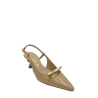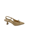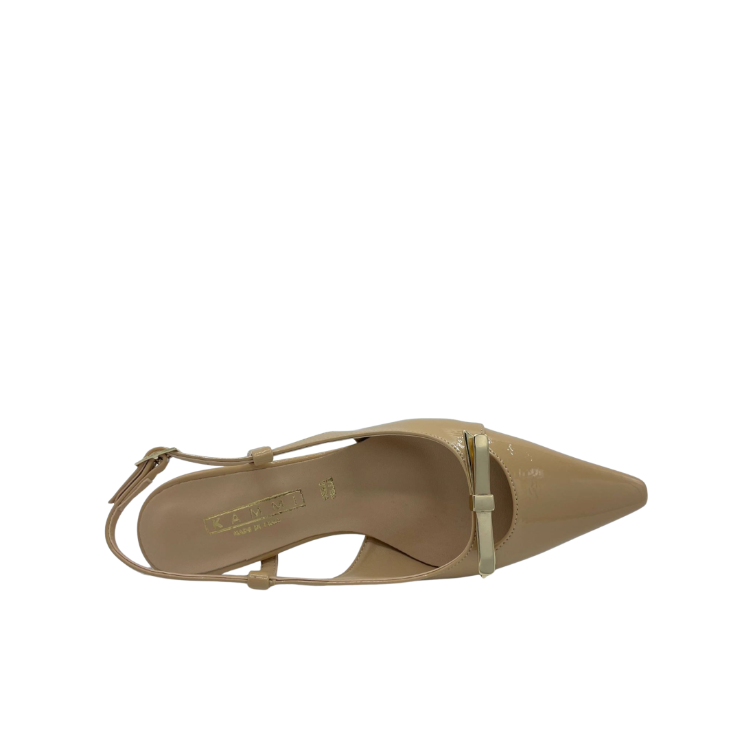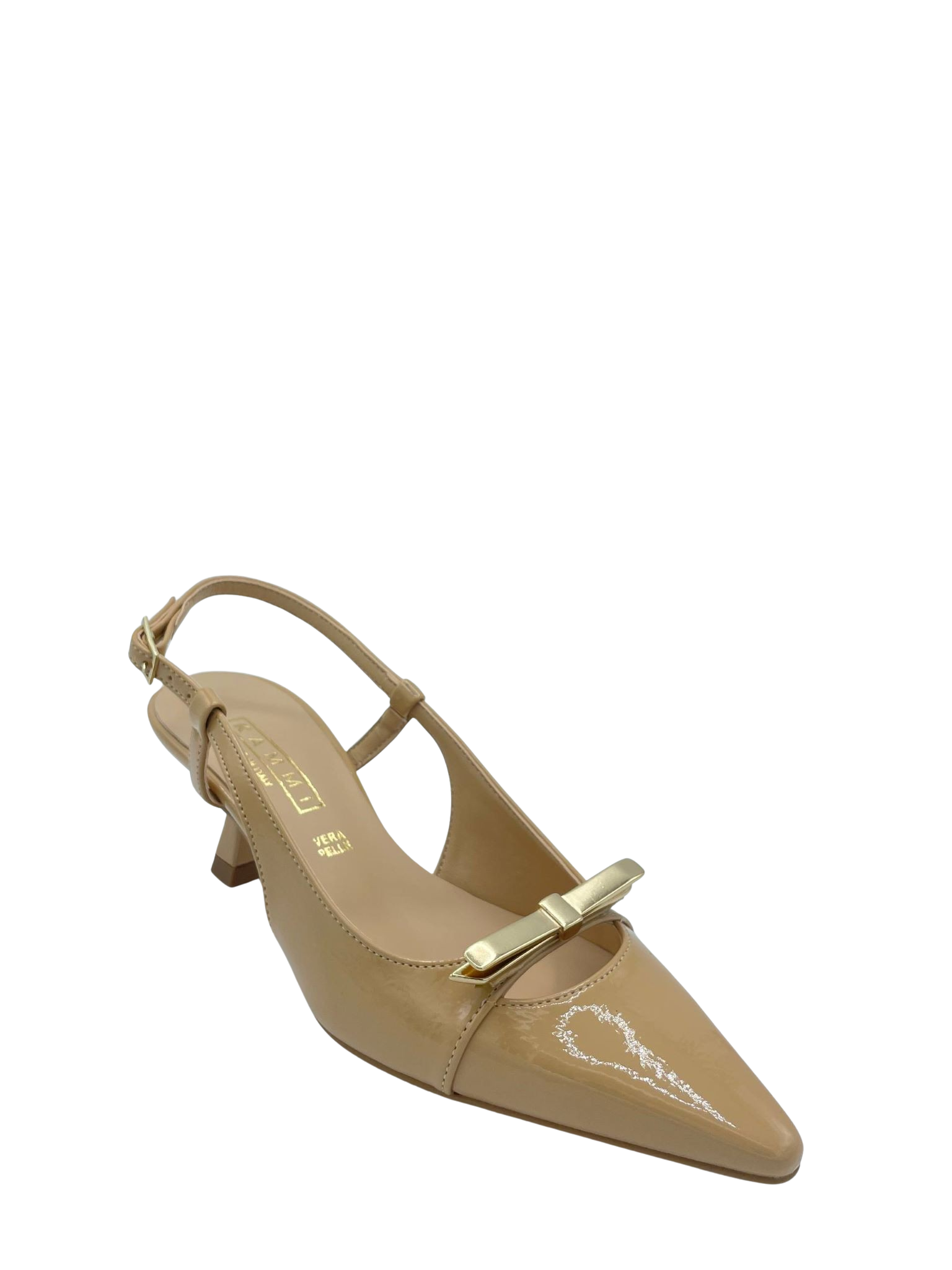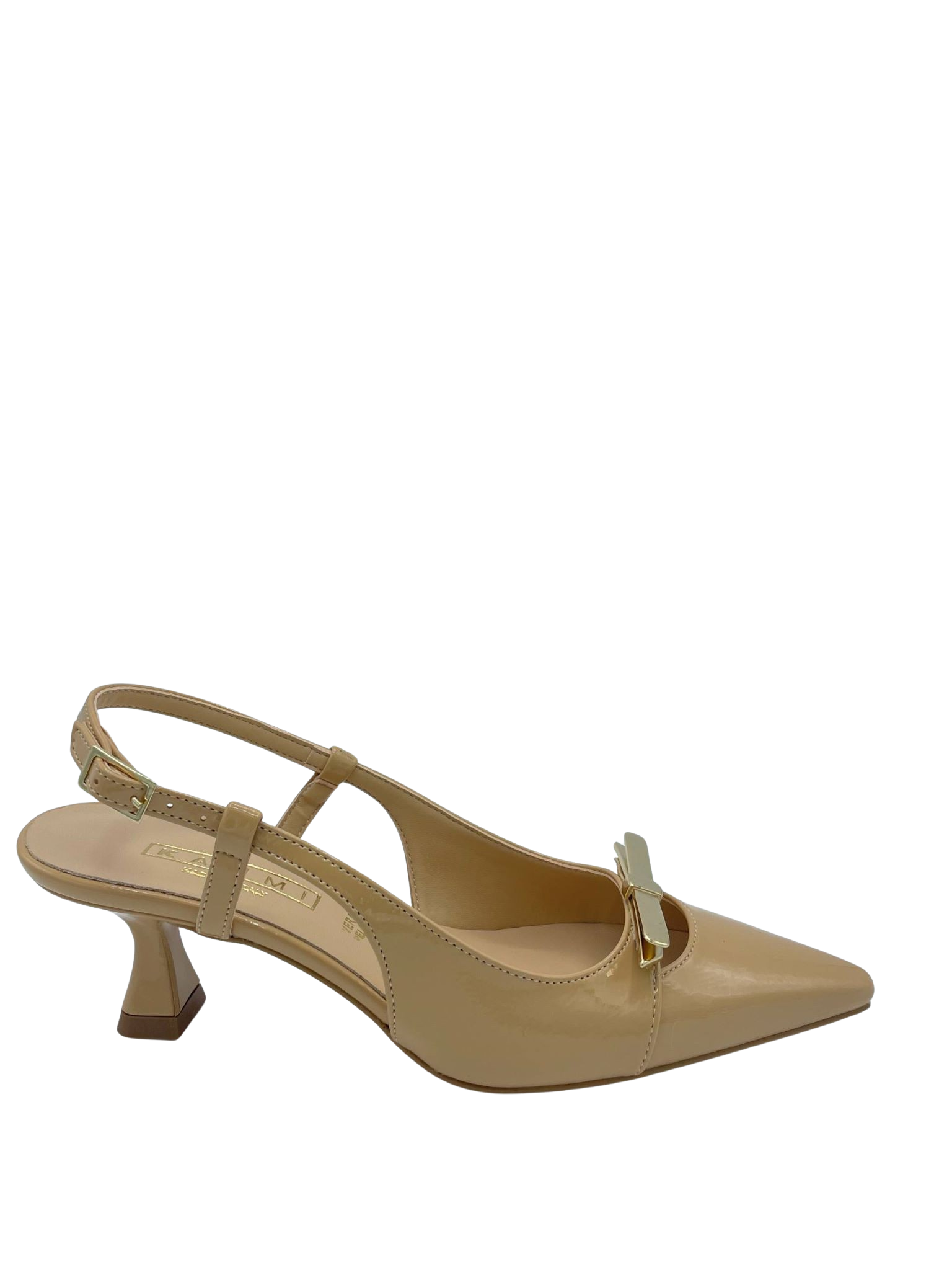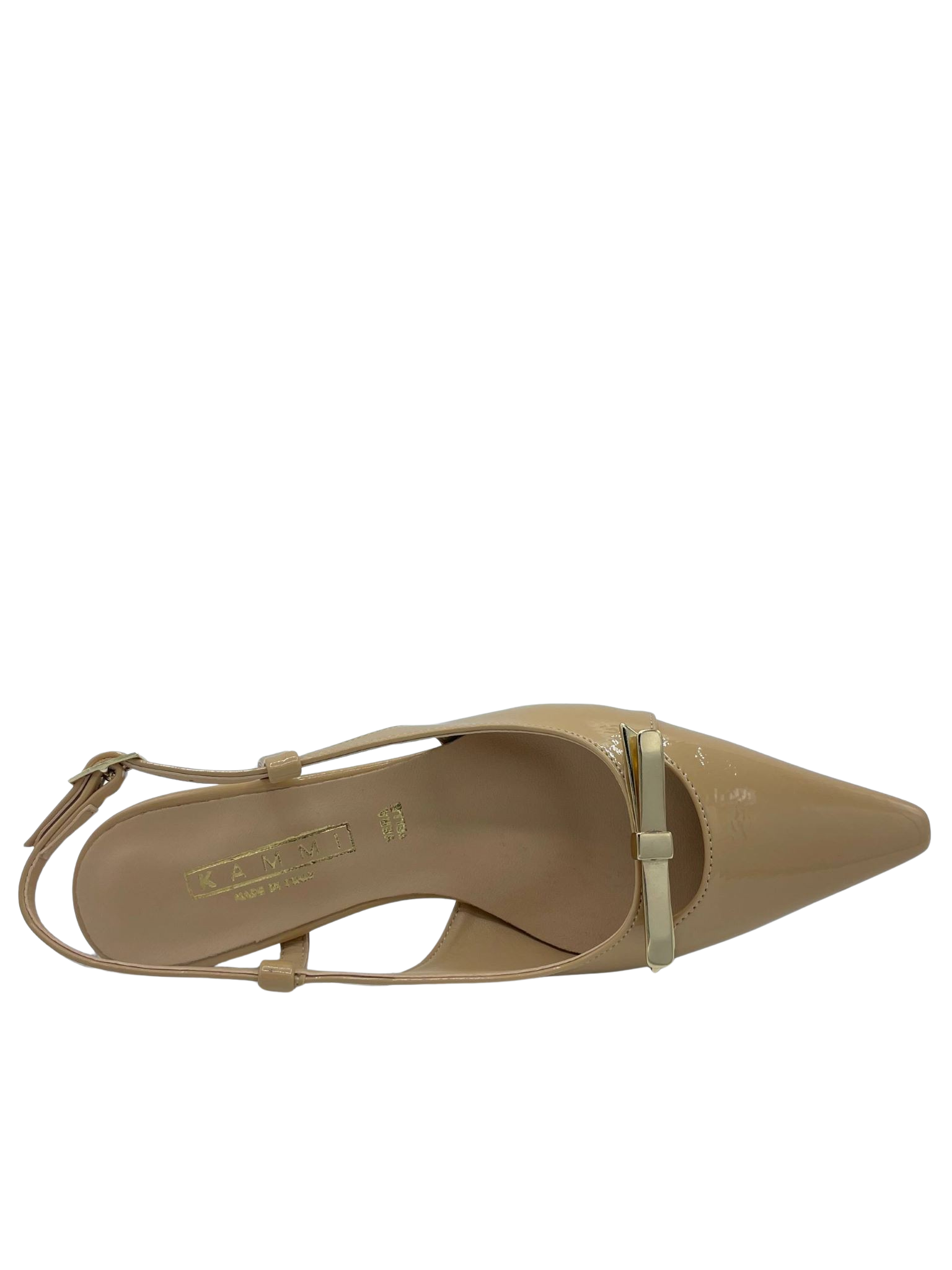 Slingback con tomaia in ecopelle laccata e cinturino regolabile. Tacco alto 5 cm. Applicazione fiocchetto di metallo sul davanti. Sottopiede in vera pelle e fondo in tunit. Made in Italy e lavorazione artigianale.