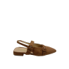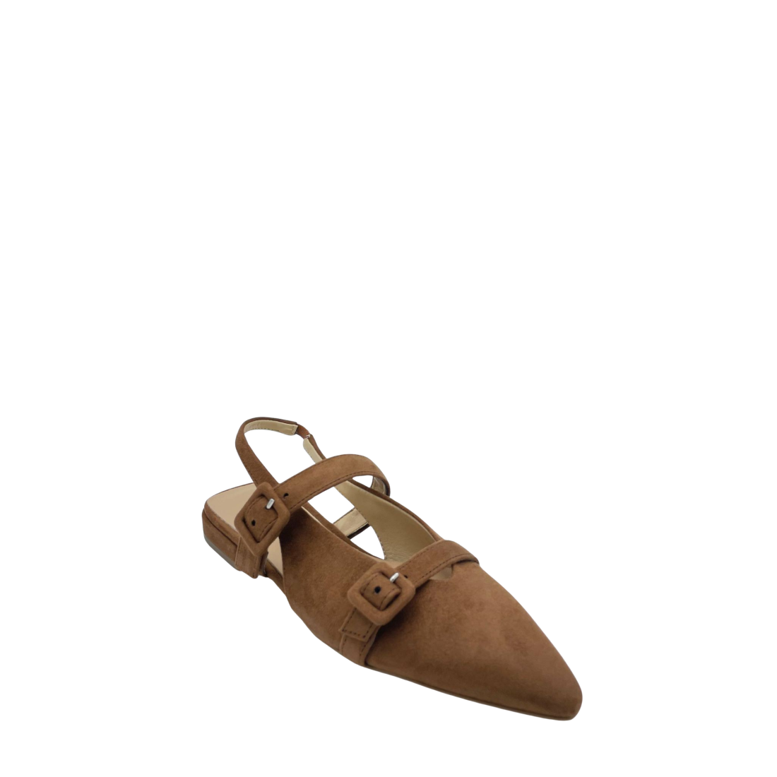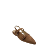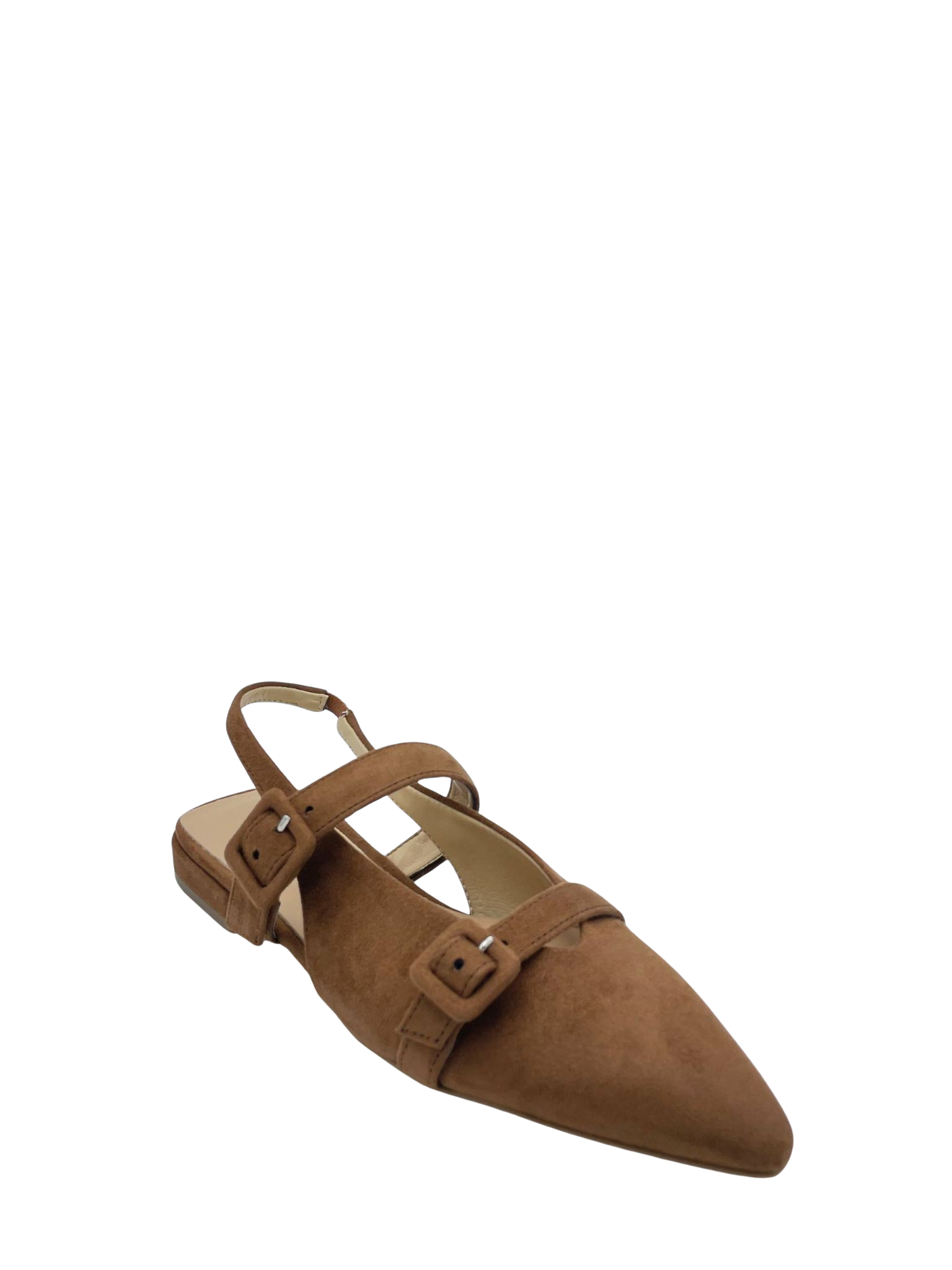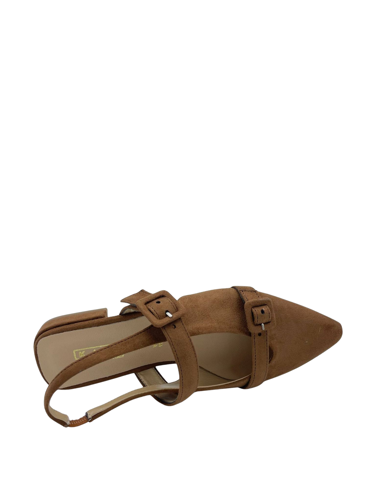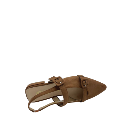 Slingback con tomaia in ecopelle effetto scamosciato e sottopiede in vera pelle. Cinturino elastico e doppia fibbia sul collo del piede. Tacco basso 1 cm. Fondo in tunit. Made in Italy e lavorazione artigianale.