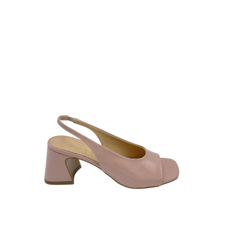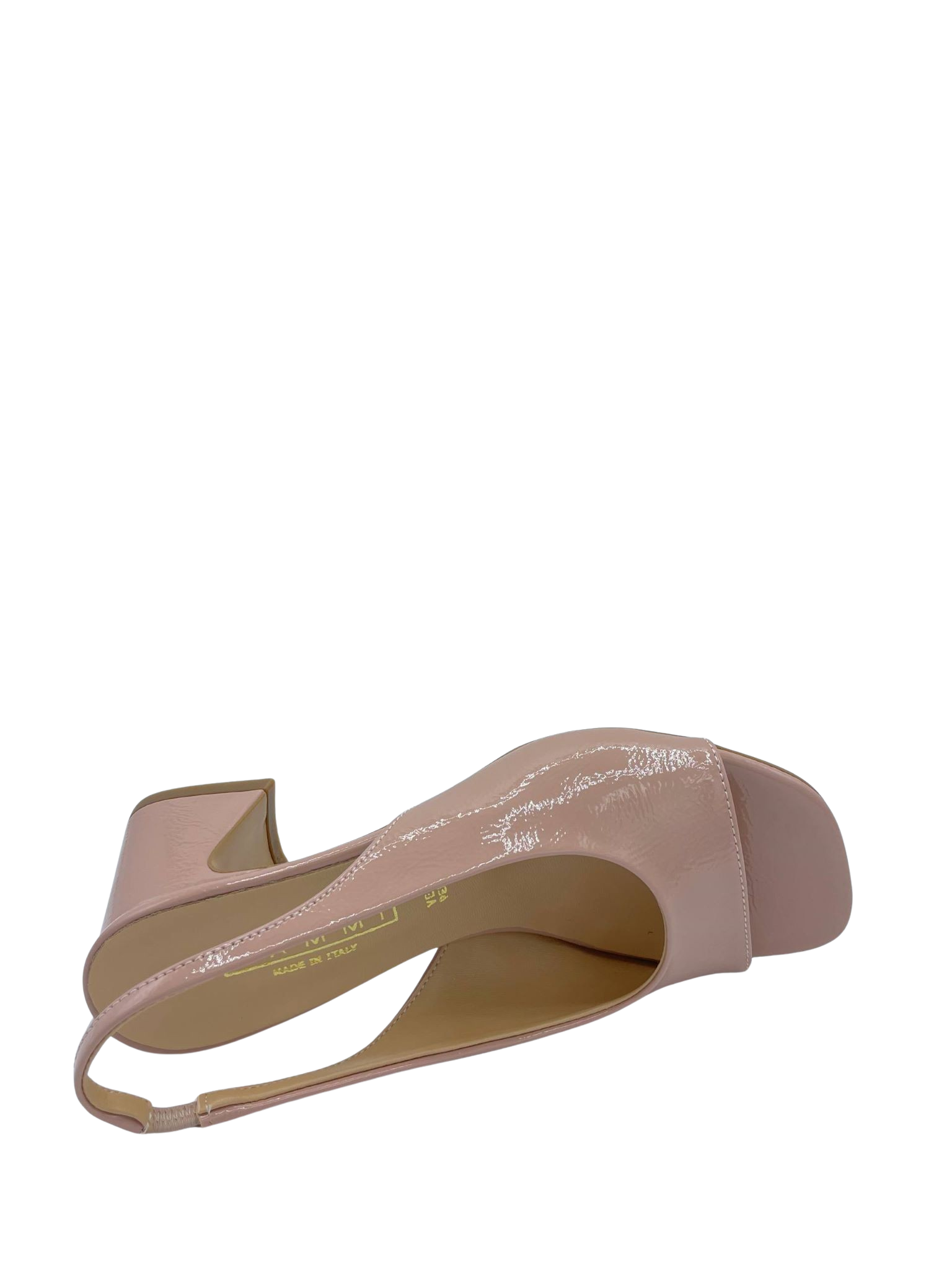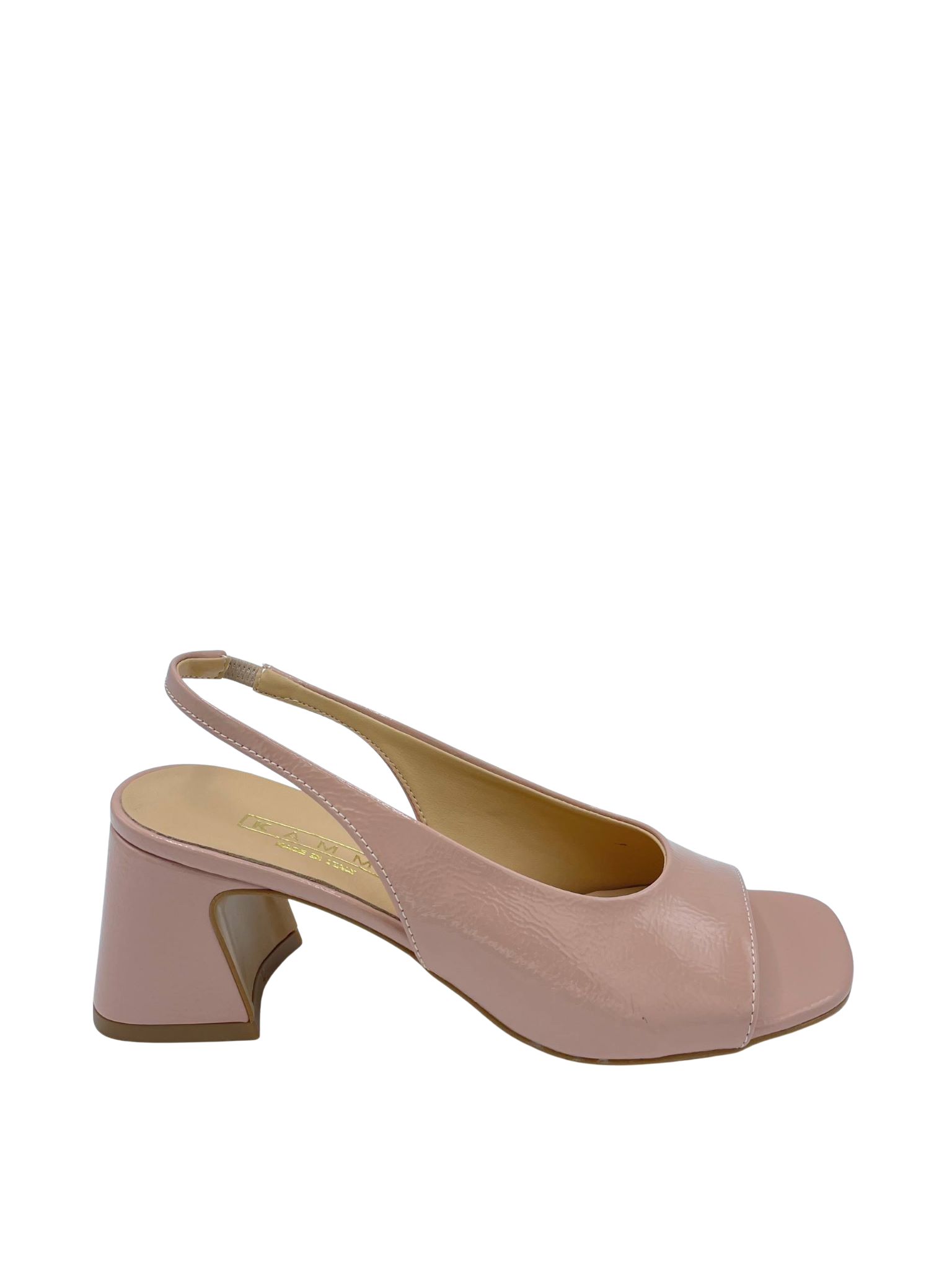 Sandalo con tomaia in ecopelle laccato e sottopiede in vera pelle. Forma squadrata , cinturino elastico e tacco largo alto 5 cm. Fondo in tunit. Made in Italy e lavorazione artigianale.