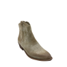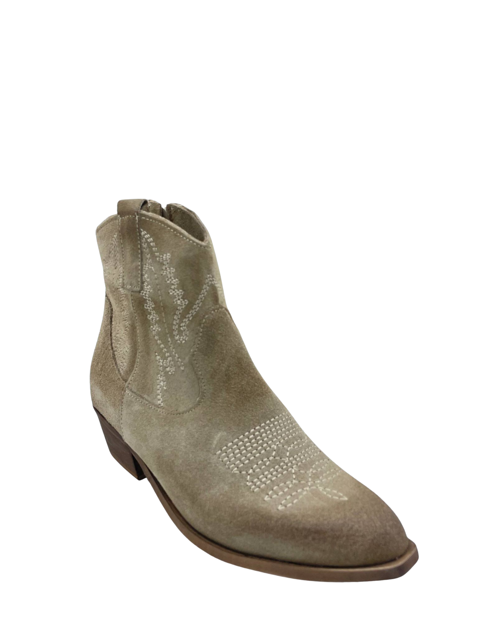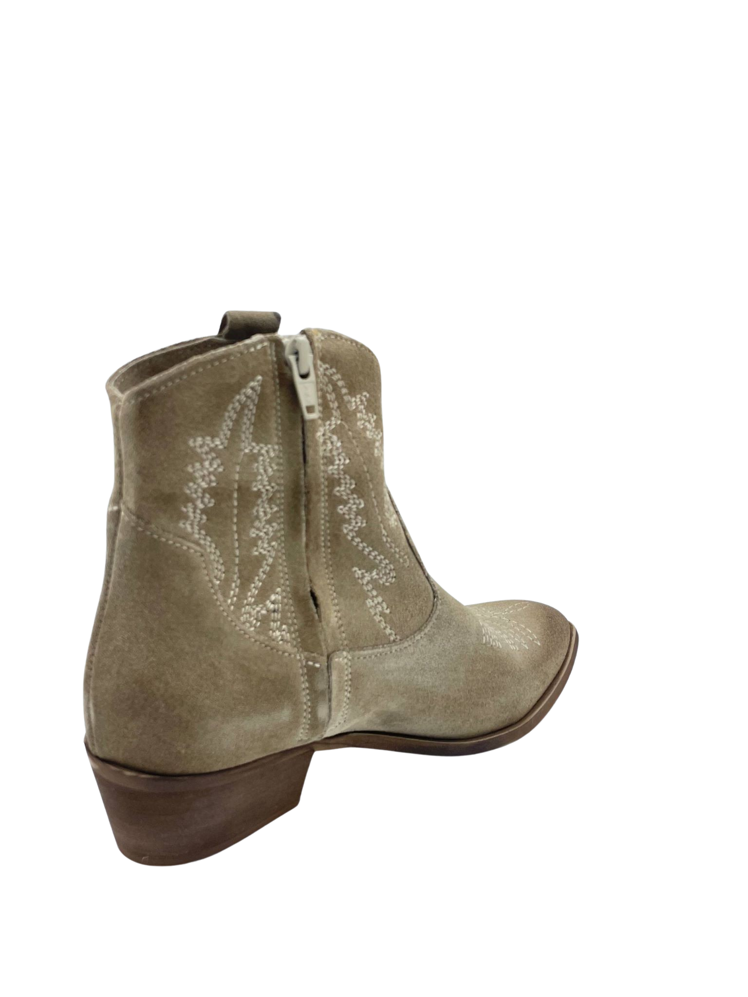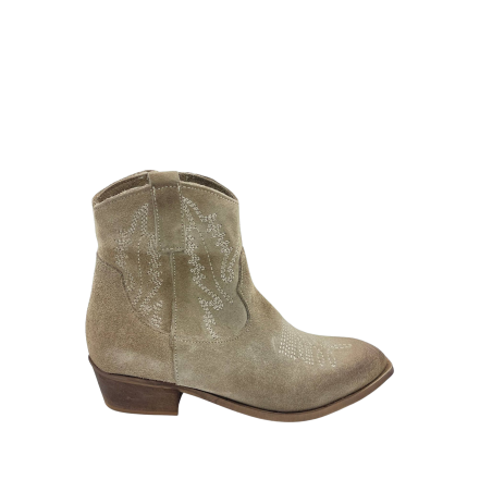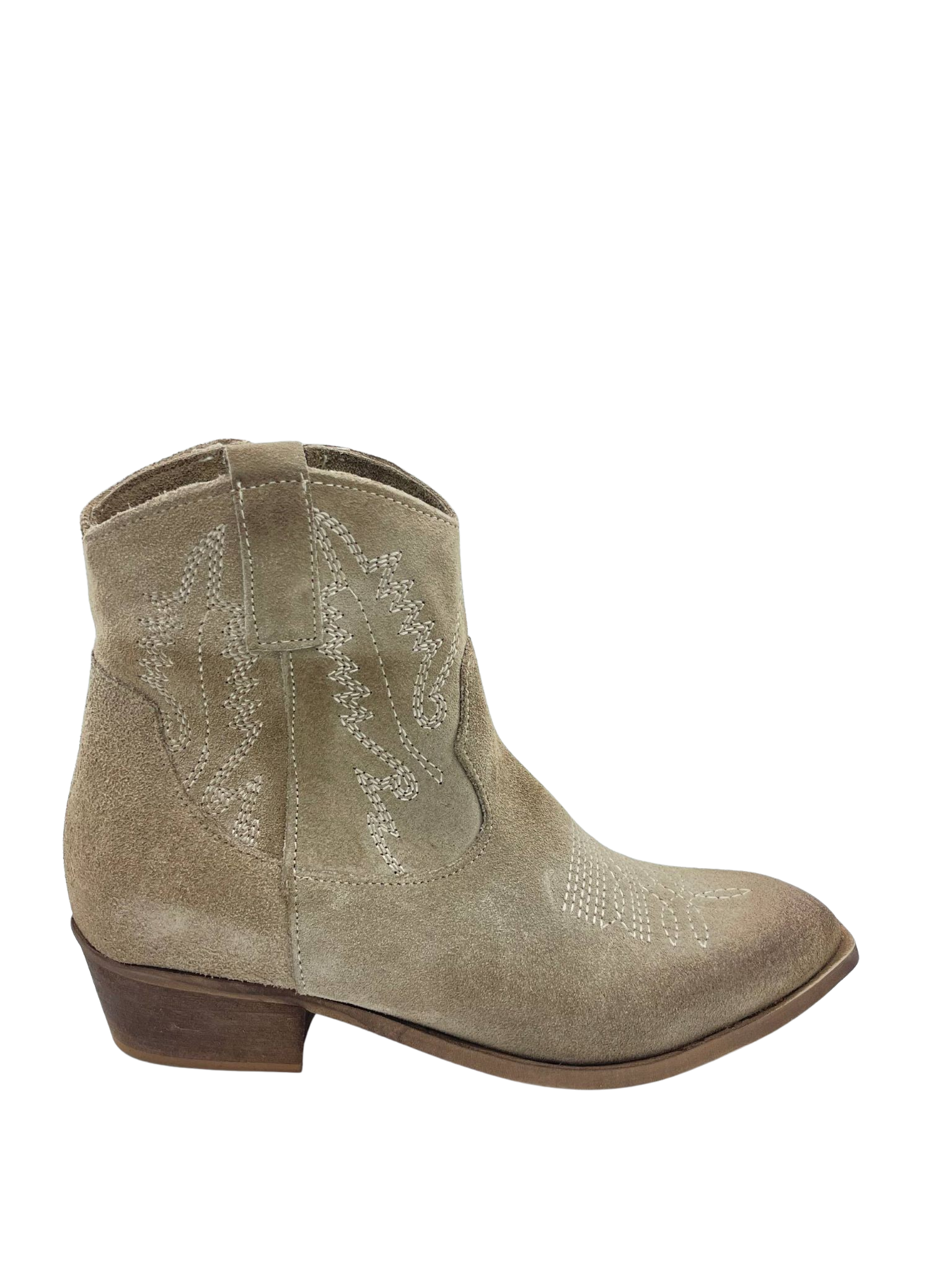 Stivaletto texano con tomaia e sottopiede realizzata in vera pelle sfoderata con inserti ricamati. Cerniera laterale e tacco alto 2 cm. Fondo in gomma. Made in Italy e lavorazione artigianale.
