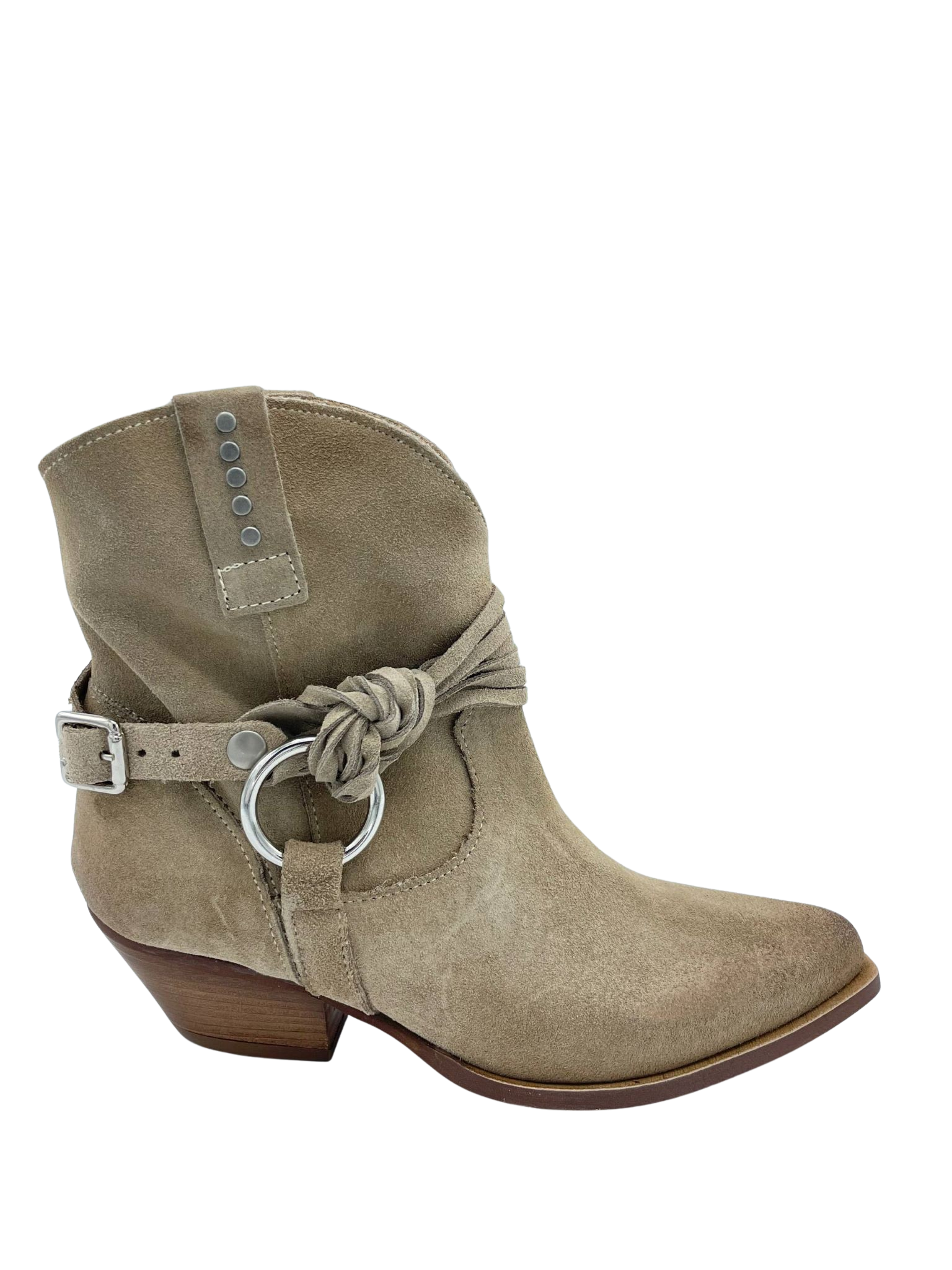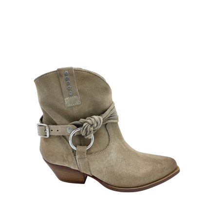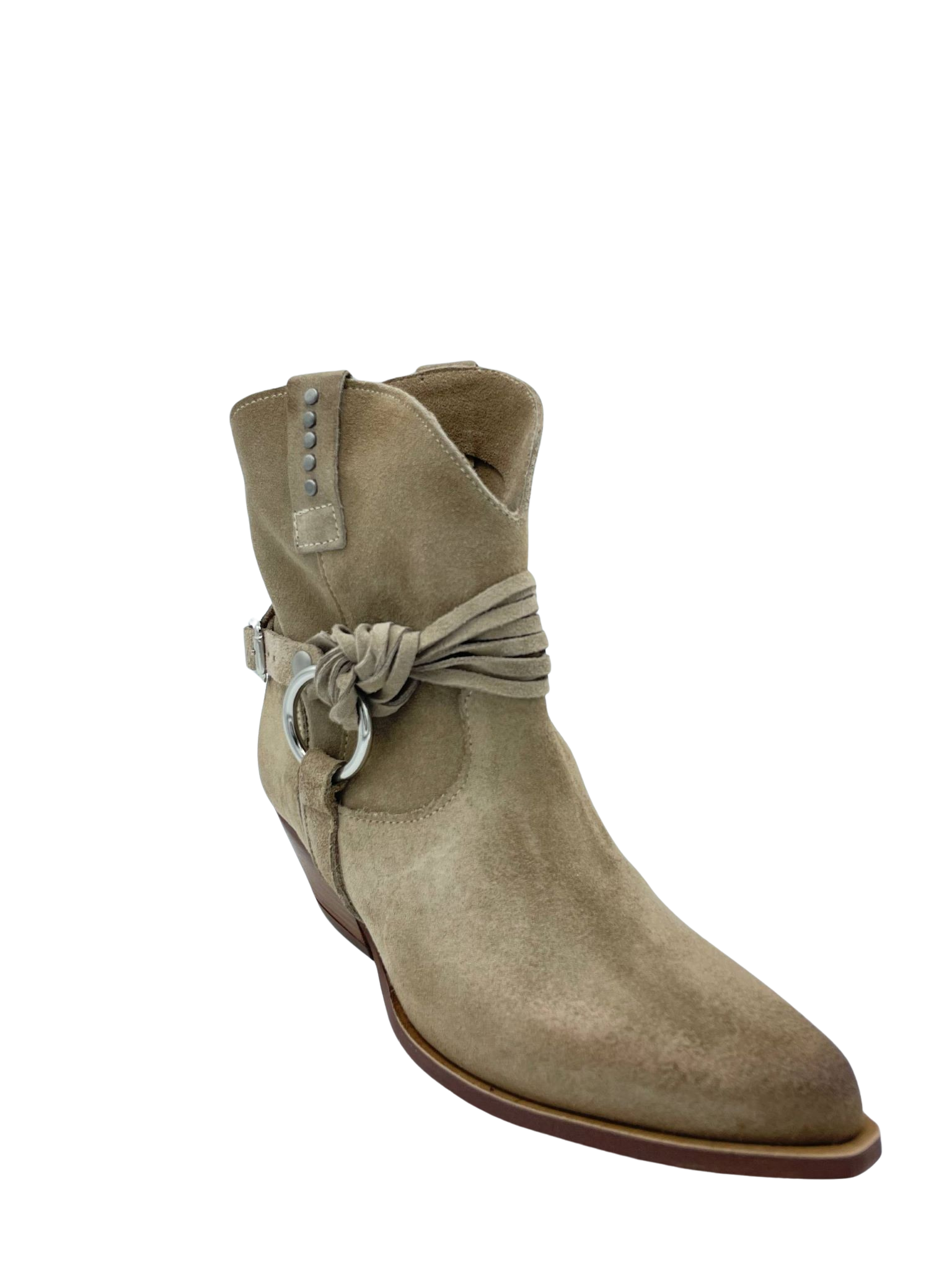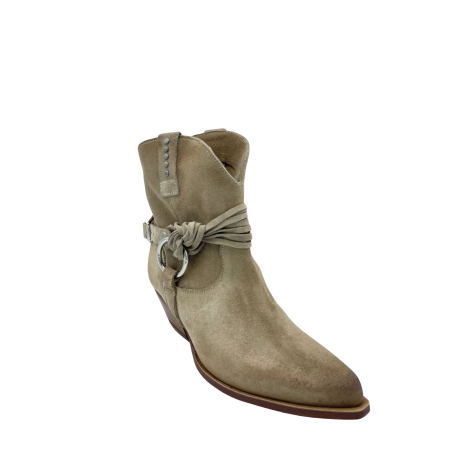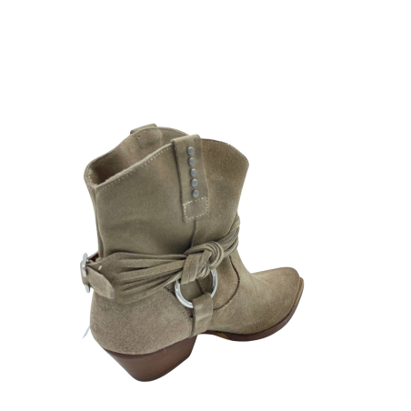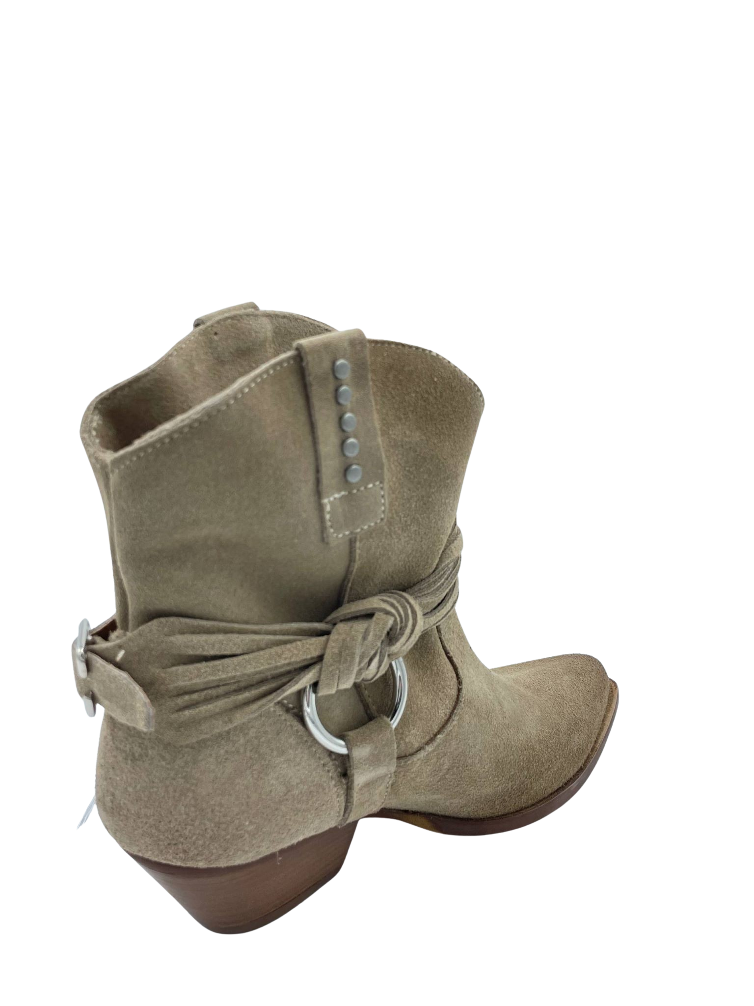 Stivaletto texano con tomaia e sottopiede realizzata in vera pelle suede sfoderata. Dettaglio cintura con fibbia e anella legata attorno. Tacco alto 5 cm. Fondo in gomma. Made in Italy e lavorazione artigianale.