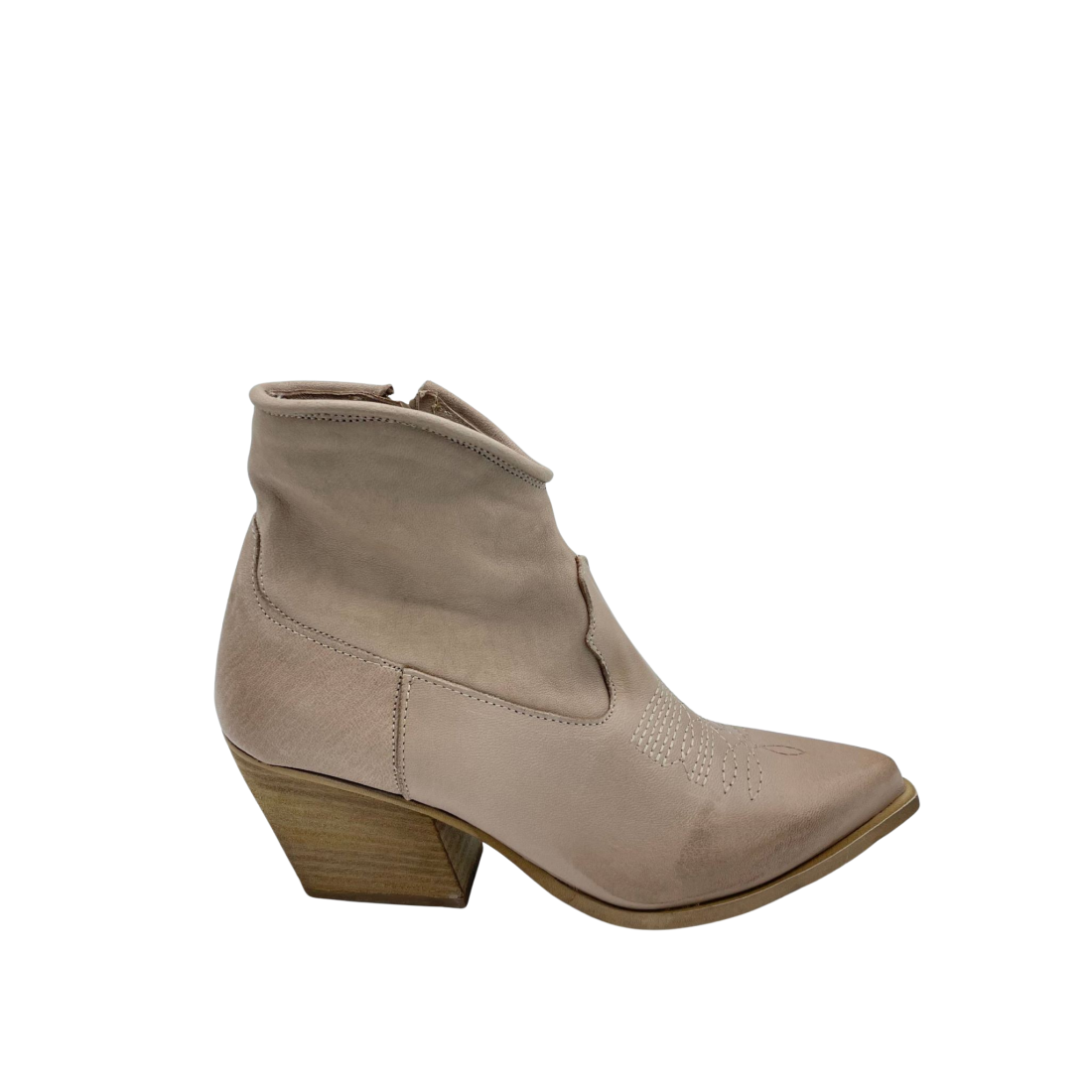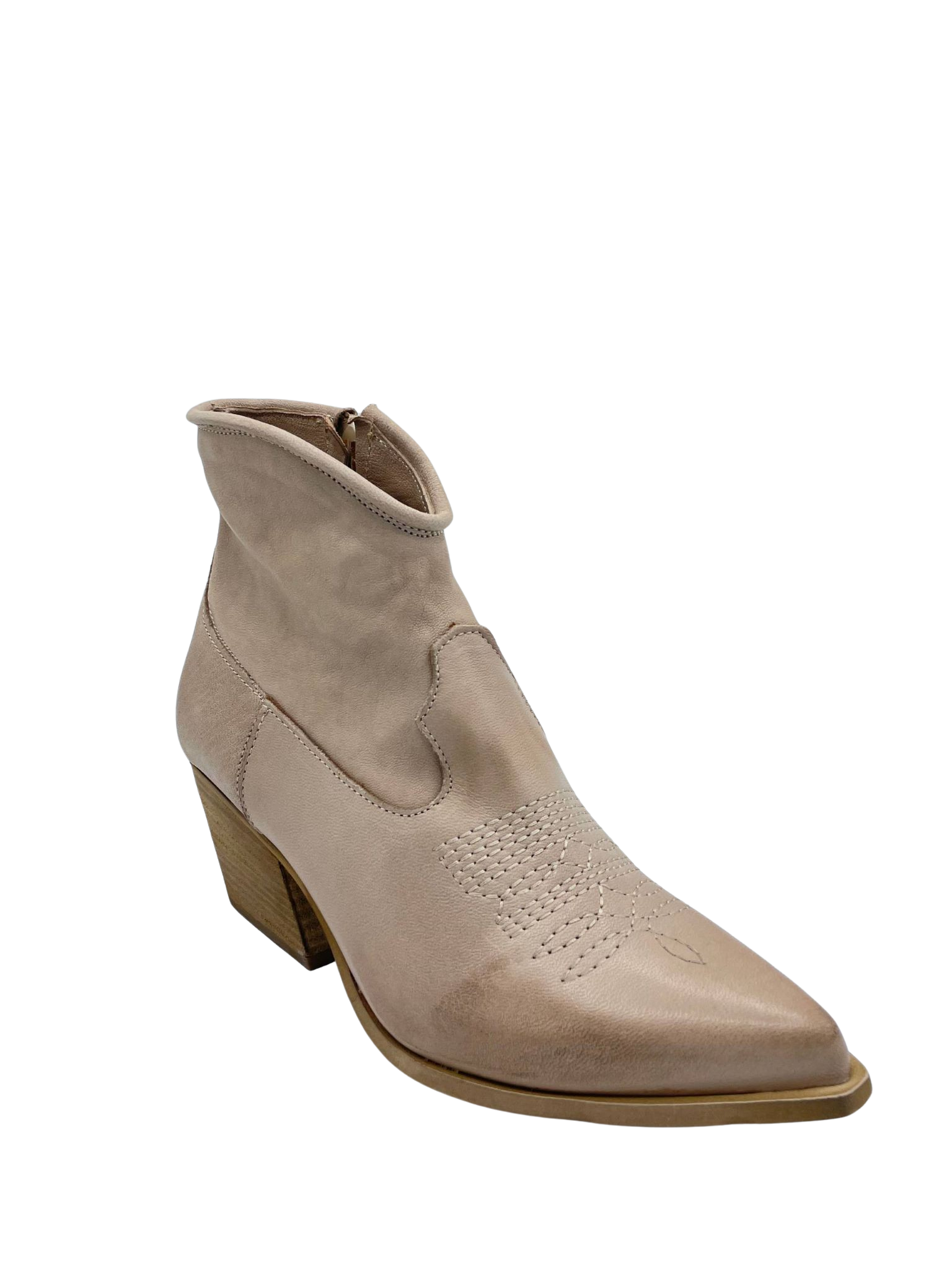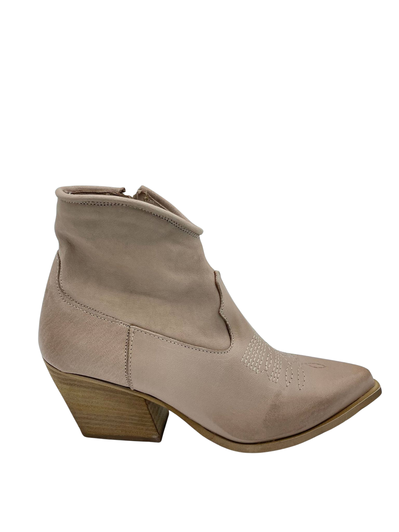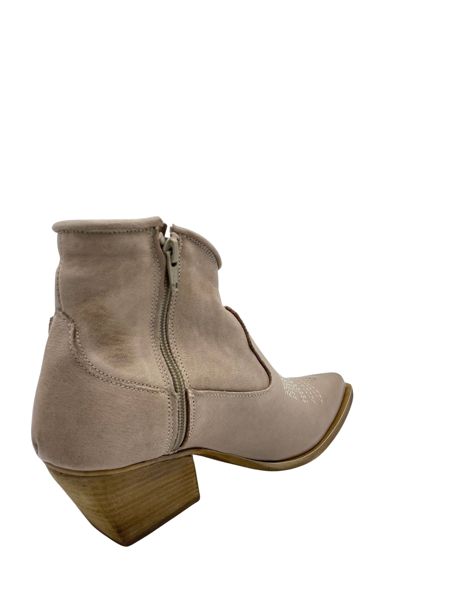 Stivaletto texano con tomaia e sottopiede in vera pelle sfoderata e con inserti ricamati sul davanti, cerniera laterale. Tacco alto 5 cm. Fondo in gomma Made in Italy e lavorazione artigianale