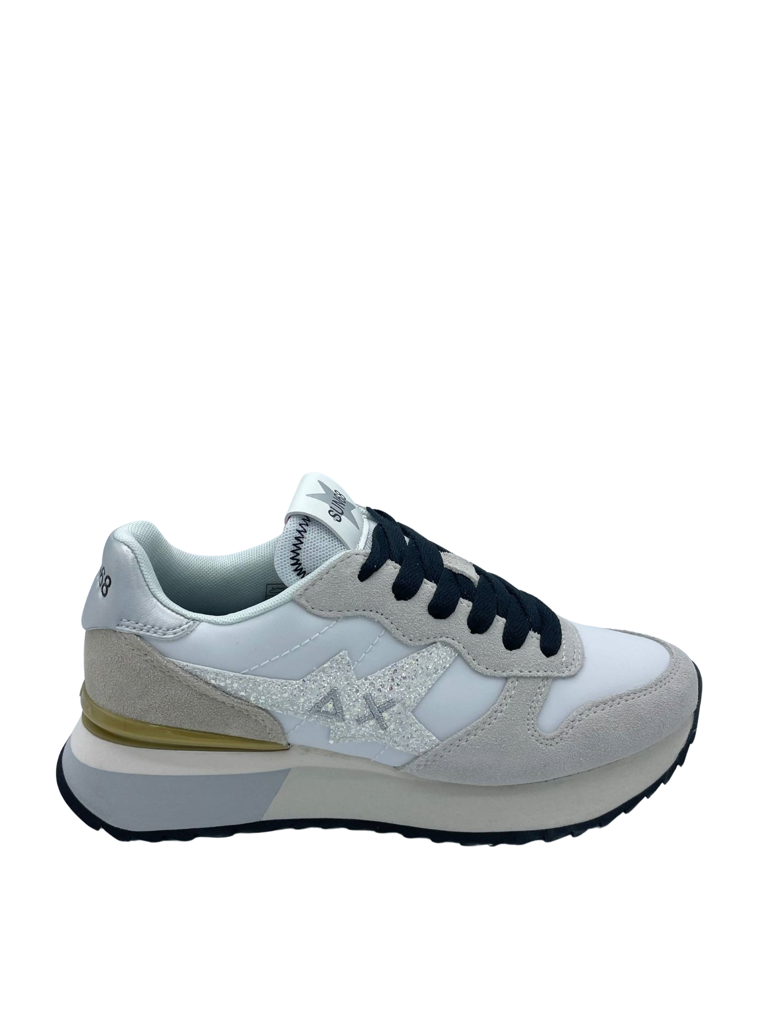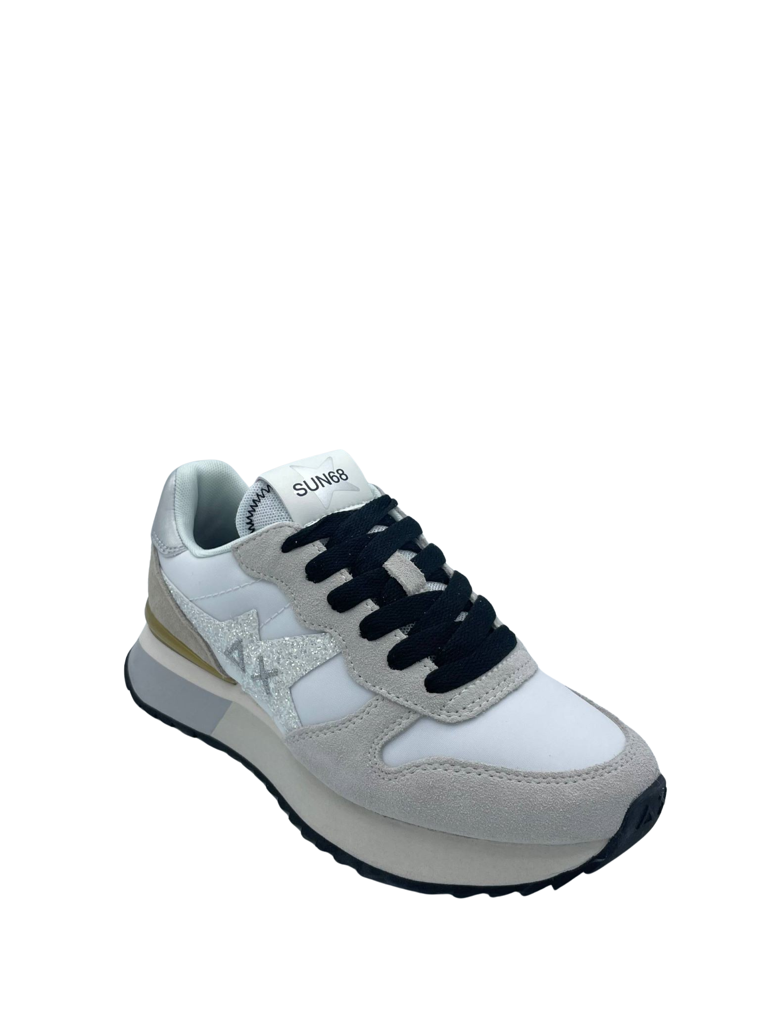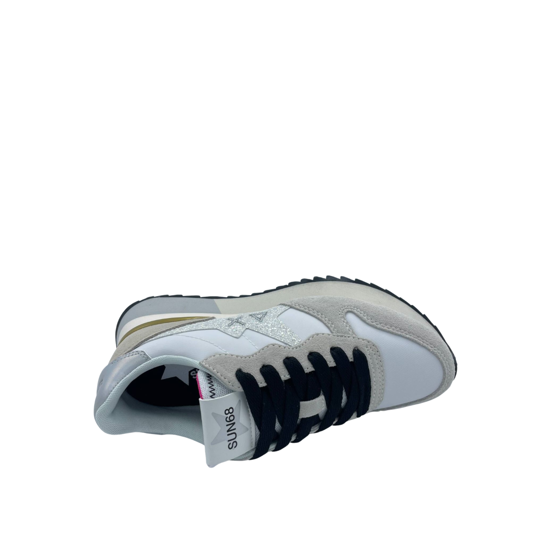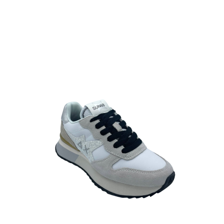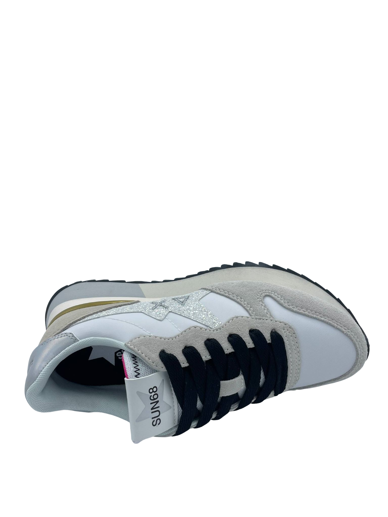 Sneaker con tomaia realizzata in nylon e suede con dettaglio laminato. Sottopiede in tessuto e soletta removibile. Chiusura con lacci e logo con glitter sul lato. Fondo in gomma.
