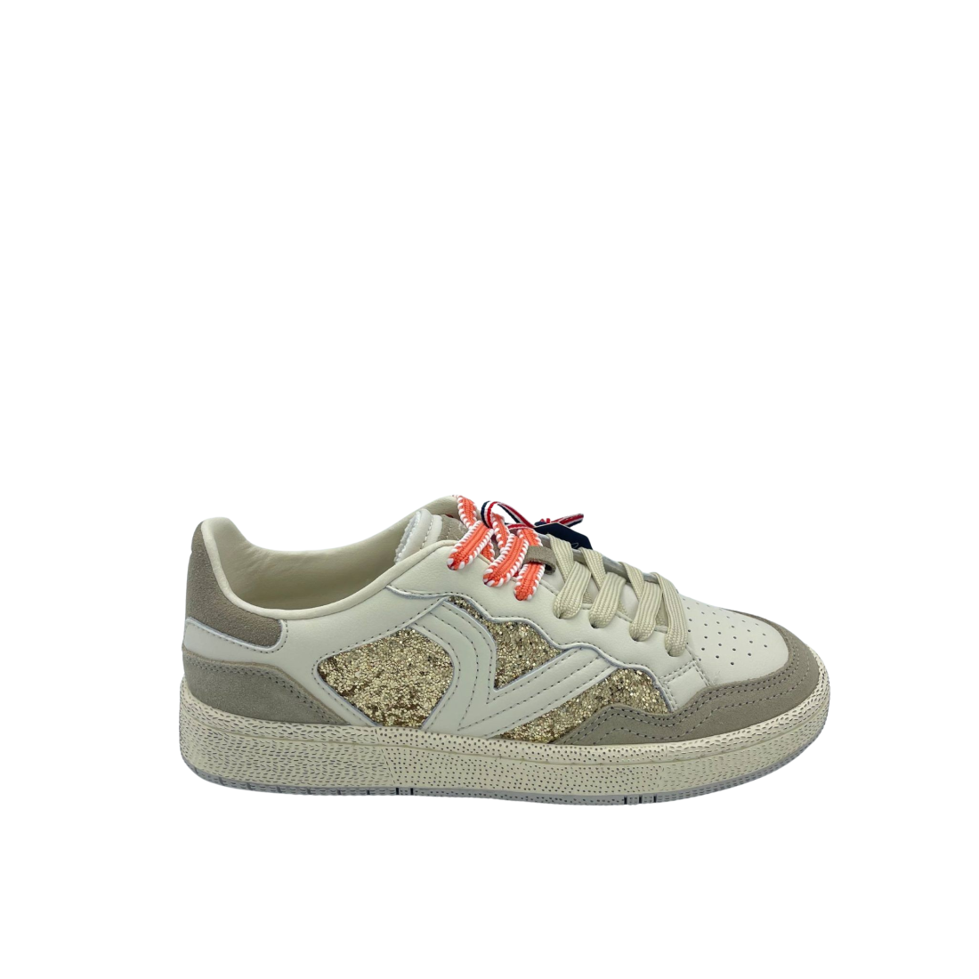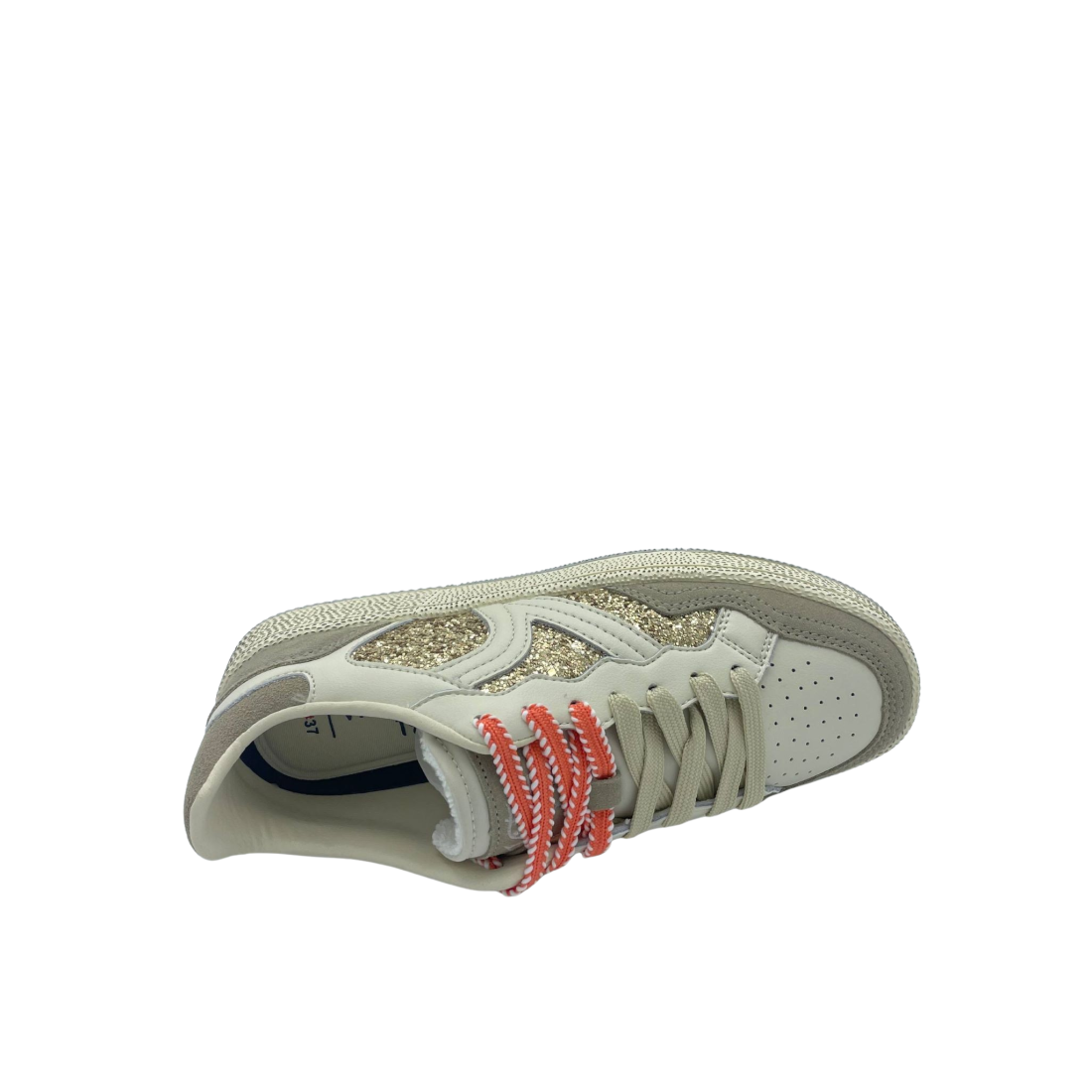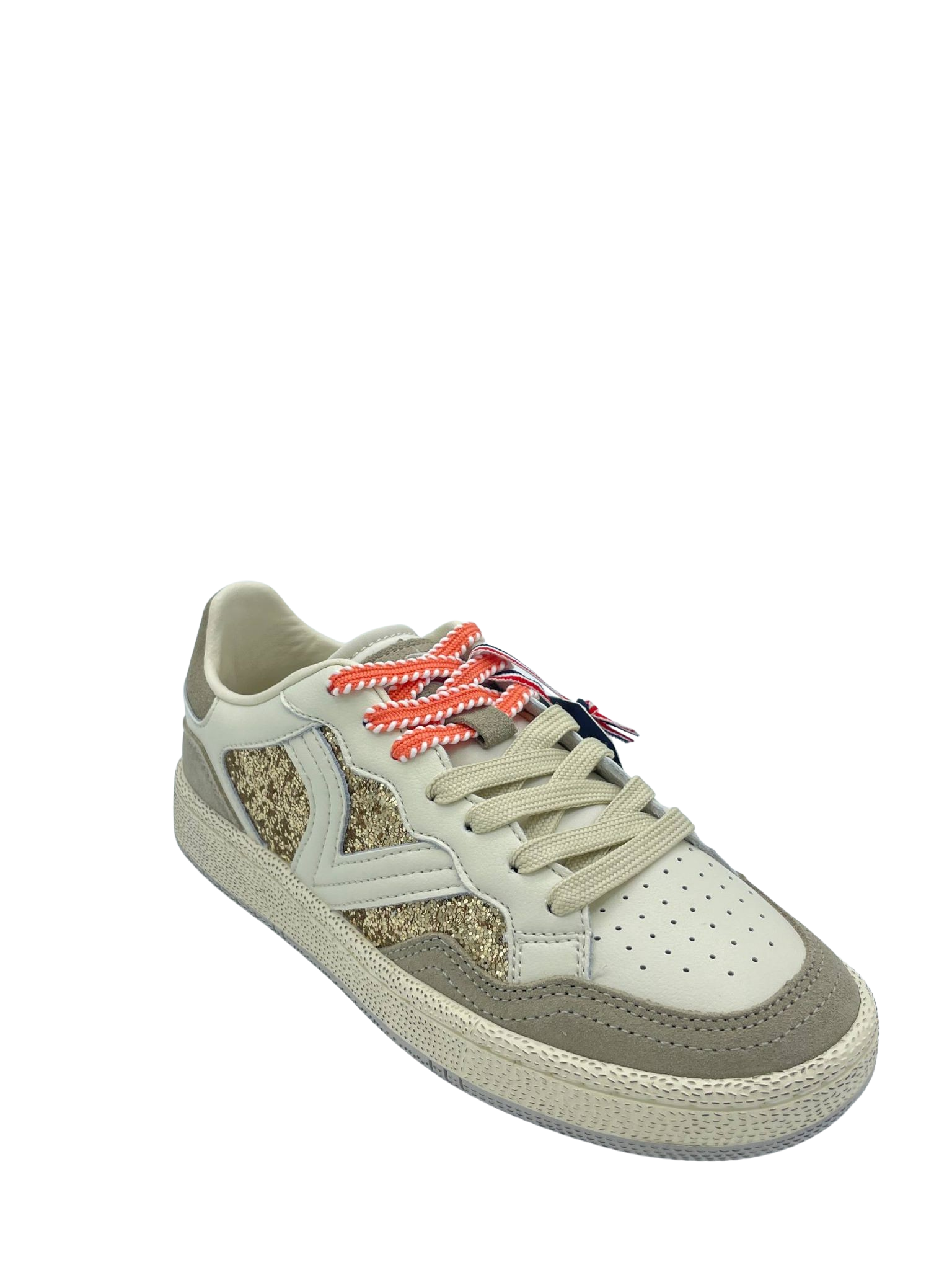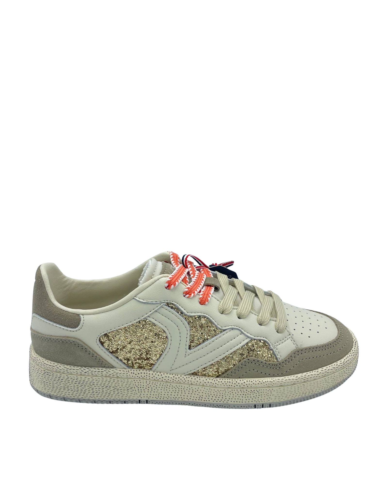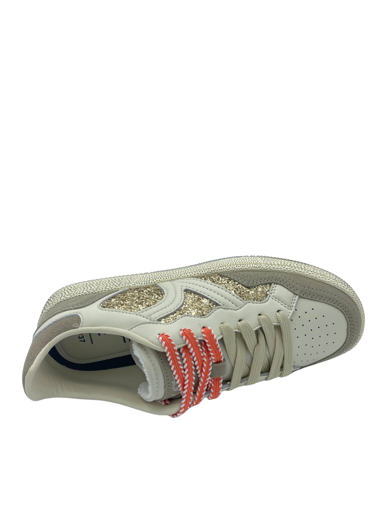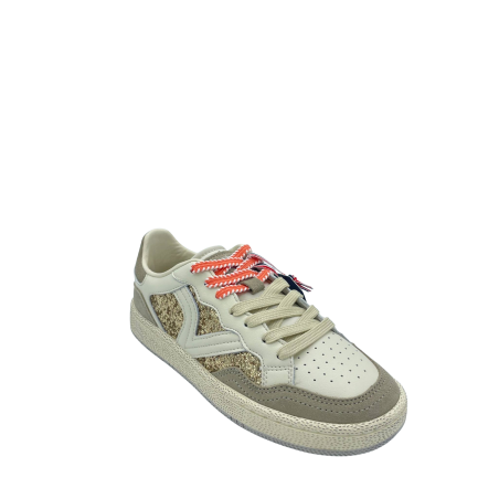 Sneaker con tomaia in vera pelle e suede con dettaglio di strass oro. Sottopiede in tessuto e doppi lacci. Fondo in gomma.