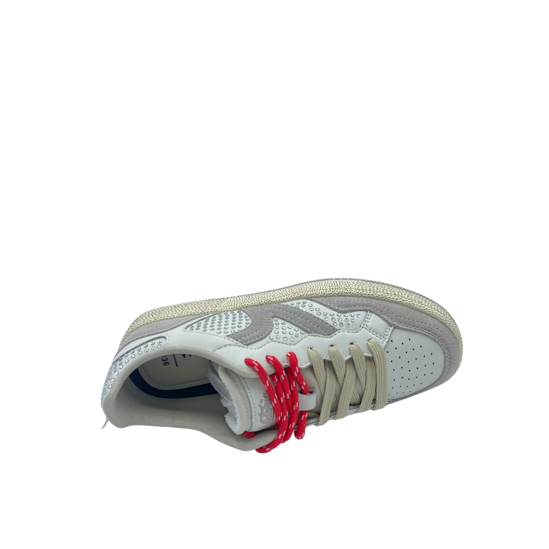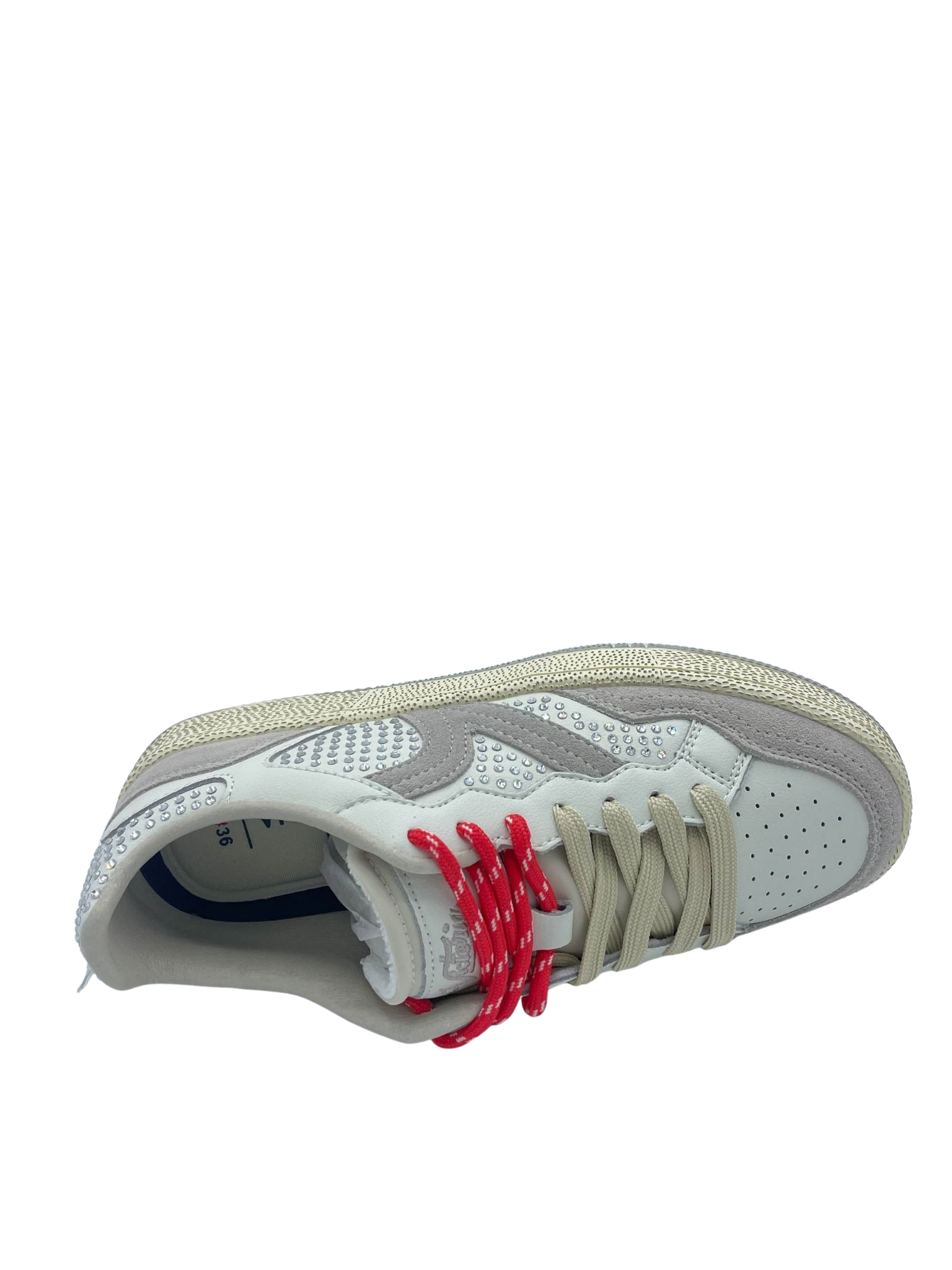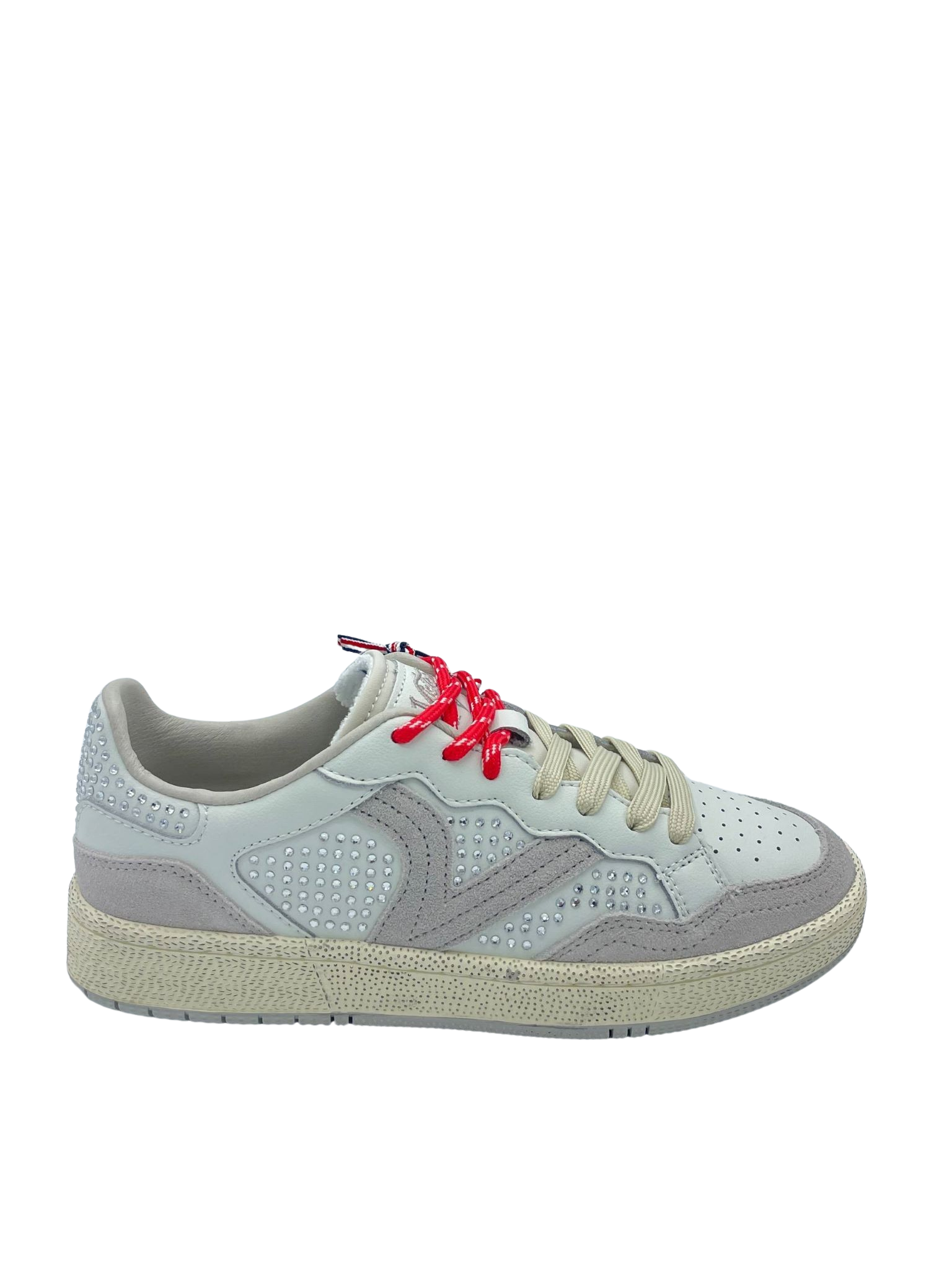 Sneaker con tomaia in vera pelle e suede con dettaglio di strass applicati. Sottopiede in tessuto, doppi lacci e logo laterale. Fondo in gomma.